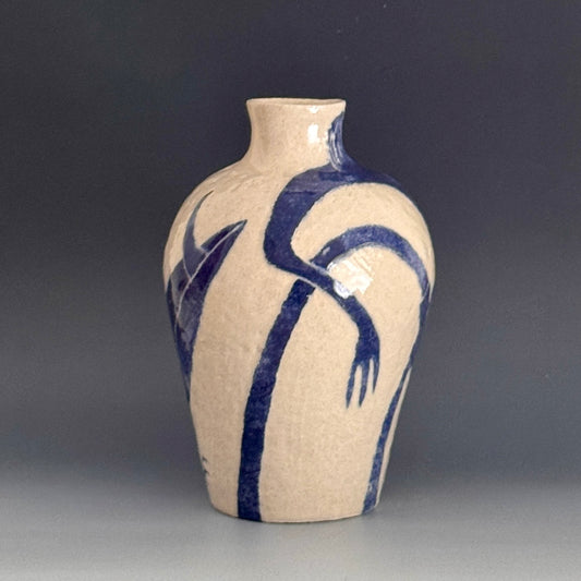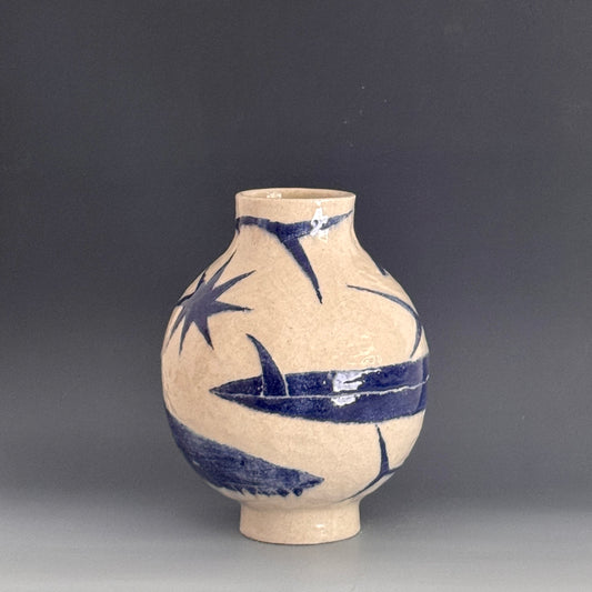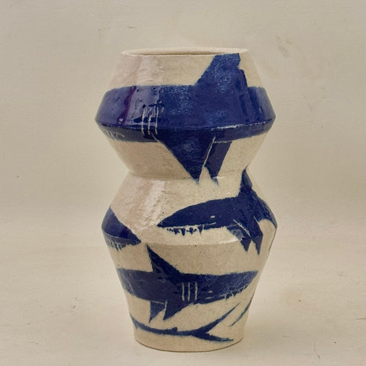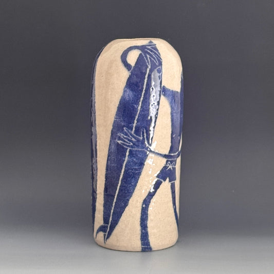 Damion Fuller is an accomplished and widely-exhibited ceramist from New South Wales, Australia, whose modest-yet-stately, vessels emblazoned with toothy sharks and other coastal dwellers, celebrate his passion for the ocean; its sciences and mythologies. Fuller's creations are concise, unadorned forms, devoid of handles and curly cues. Their handsomely modern silhouettes are reminiscent of the paintings of Giorgio Morandi. Before firing his work with cobalt slip, the artist draws into the raw clay with an intuitive line, depicting solitary figures, fish and other maritime subjects whose scale frequently wraps the form entirely, making for a type of rotational interaction with his work. They are delightful and yet serious. Optimistic even in their monasticism. - Alex Weinstein, 2025.