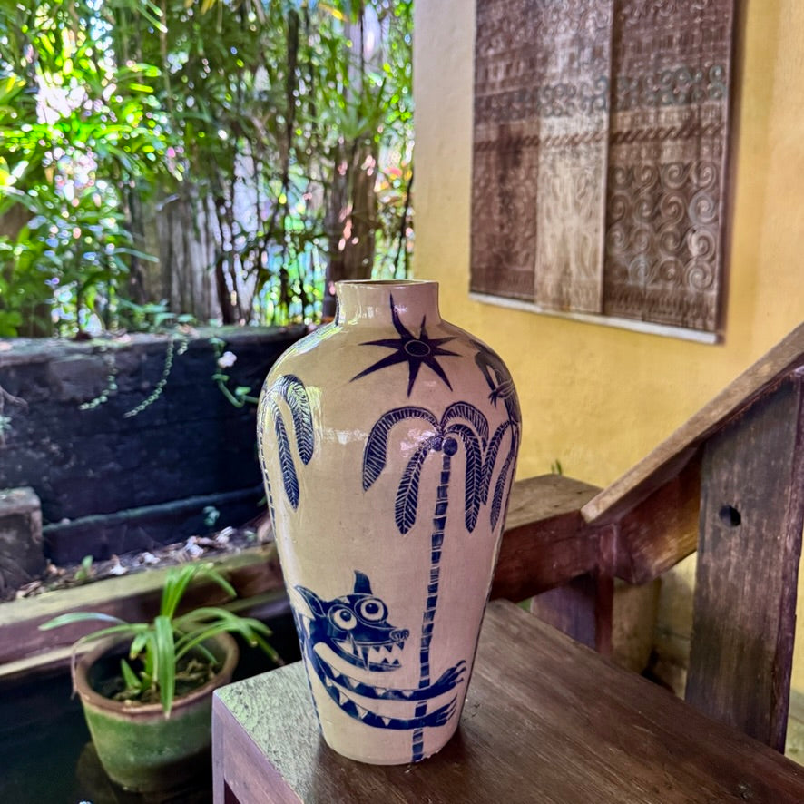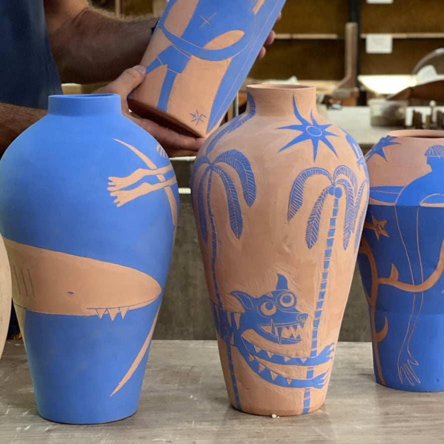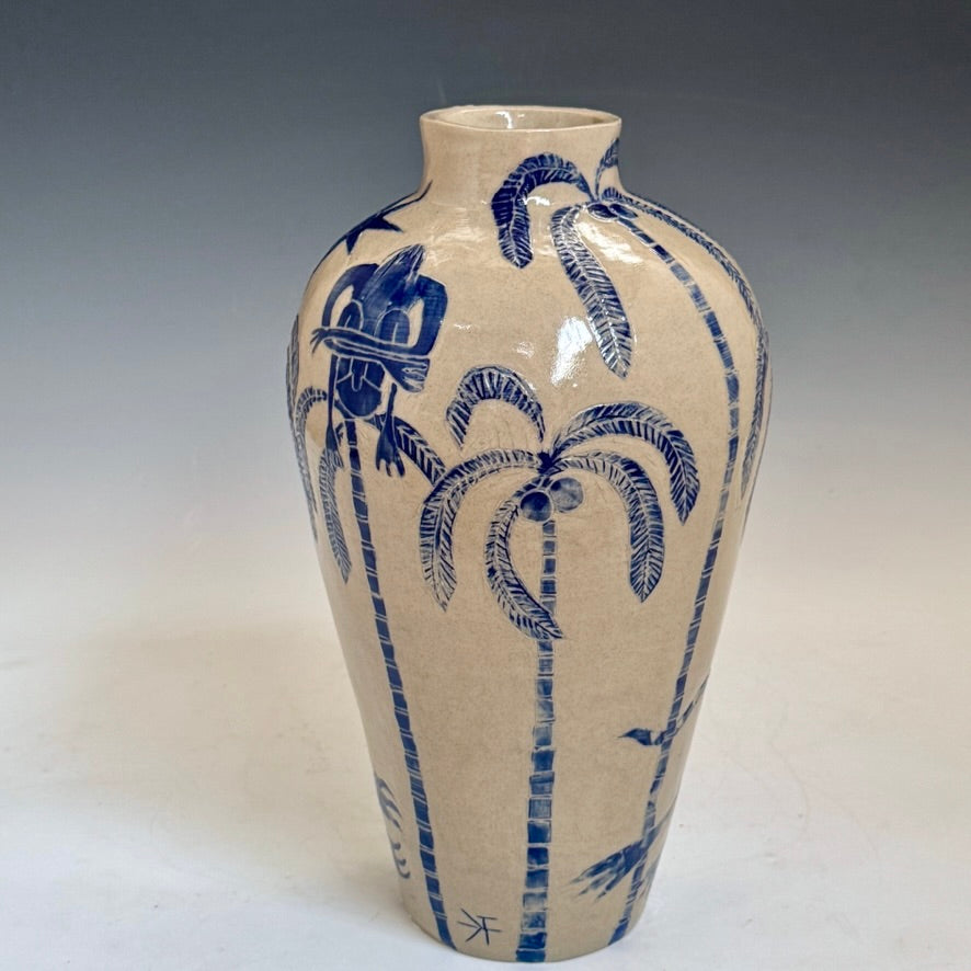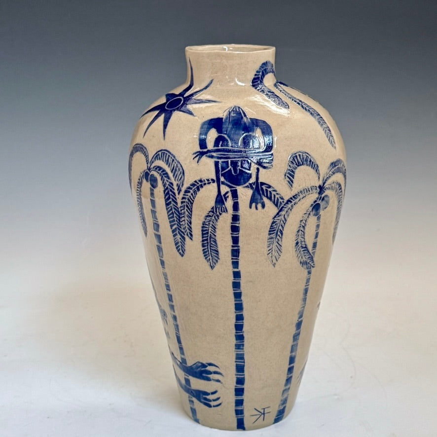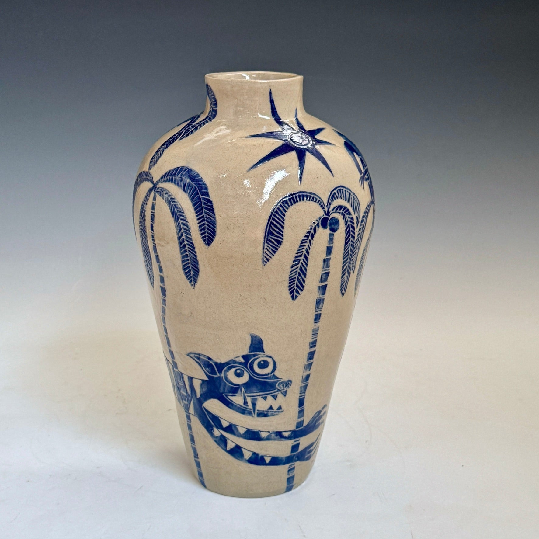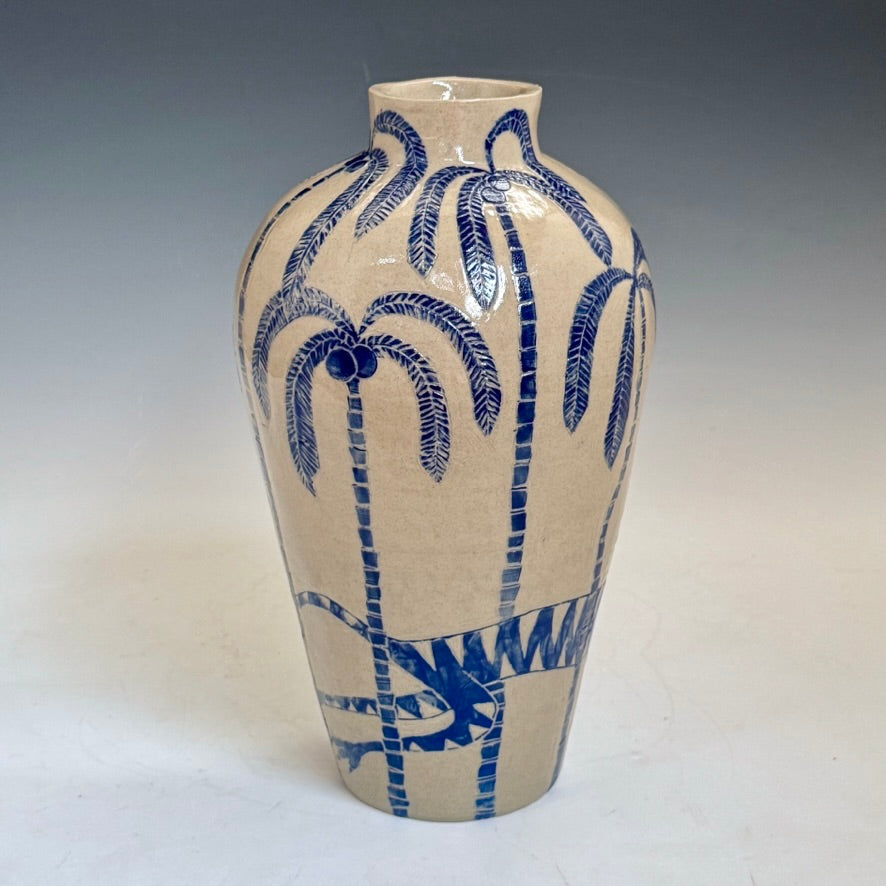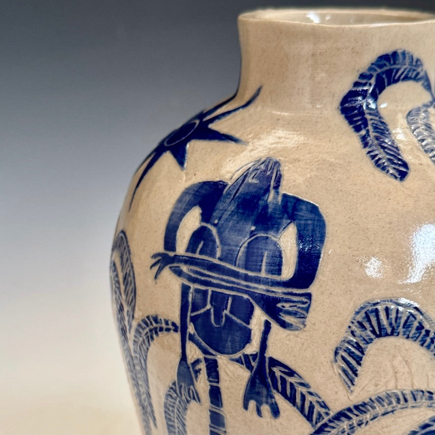 Stoneware ceramic vessel with sgraffito carved blue slip decoration.