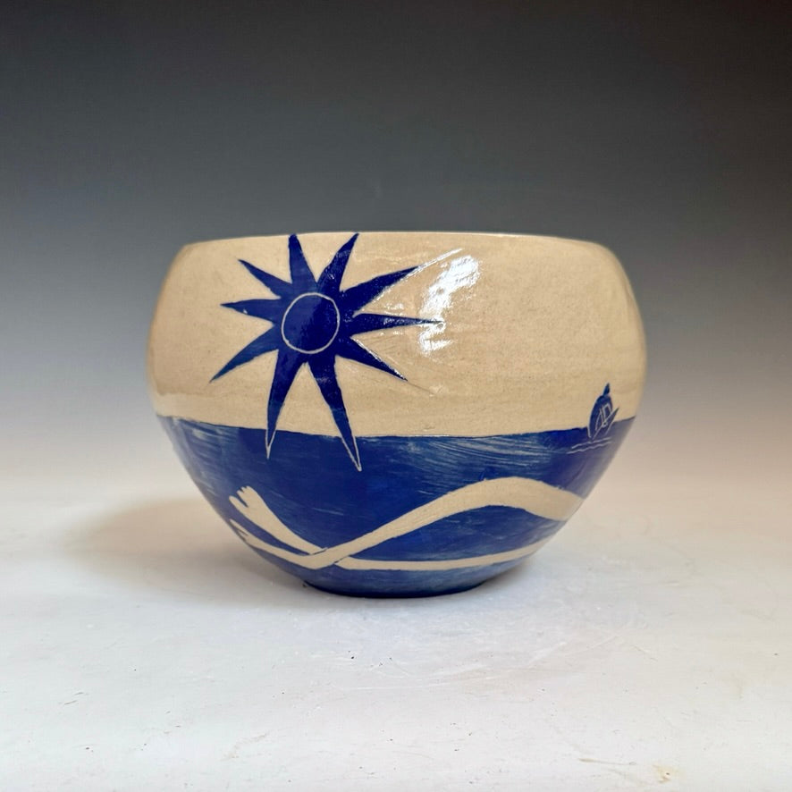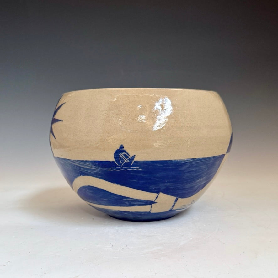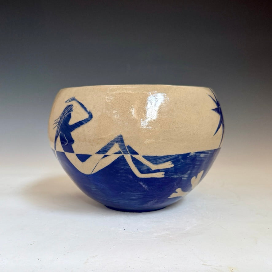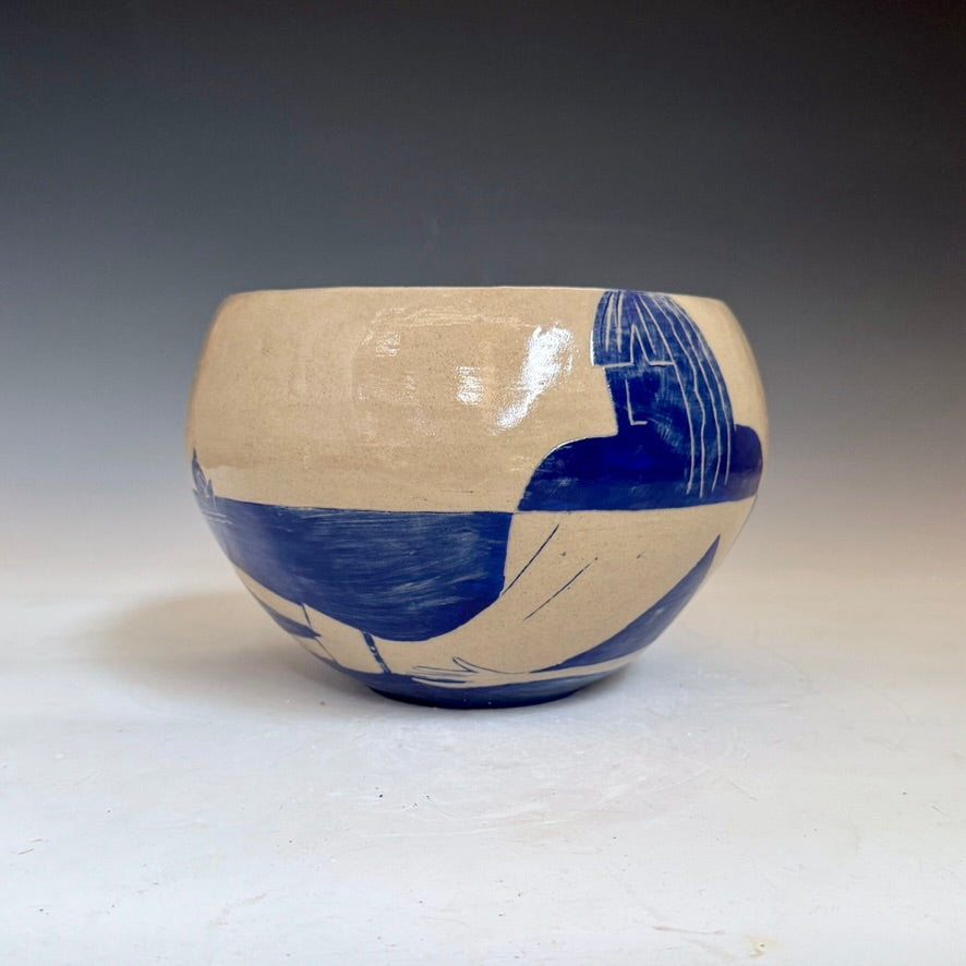 Stoneware ceramic vessel with sgraffito carved blue slip decoration.