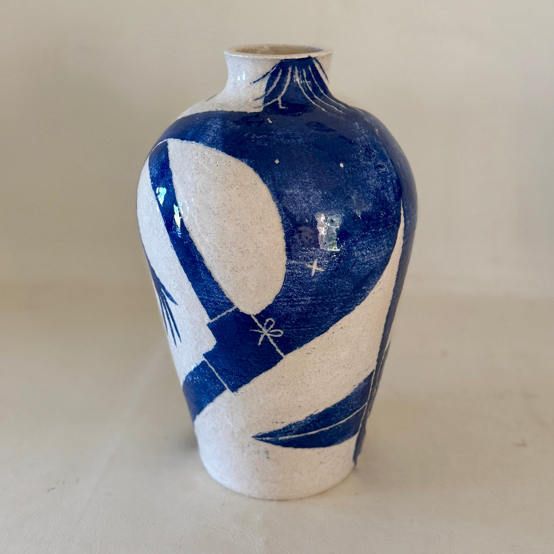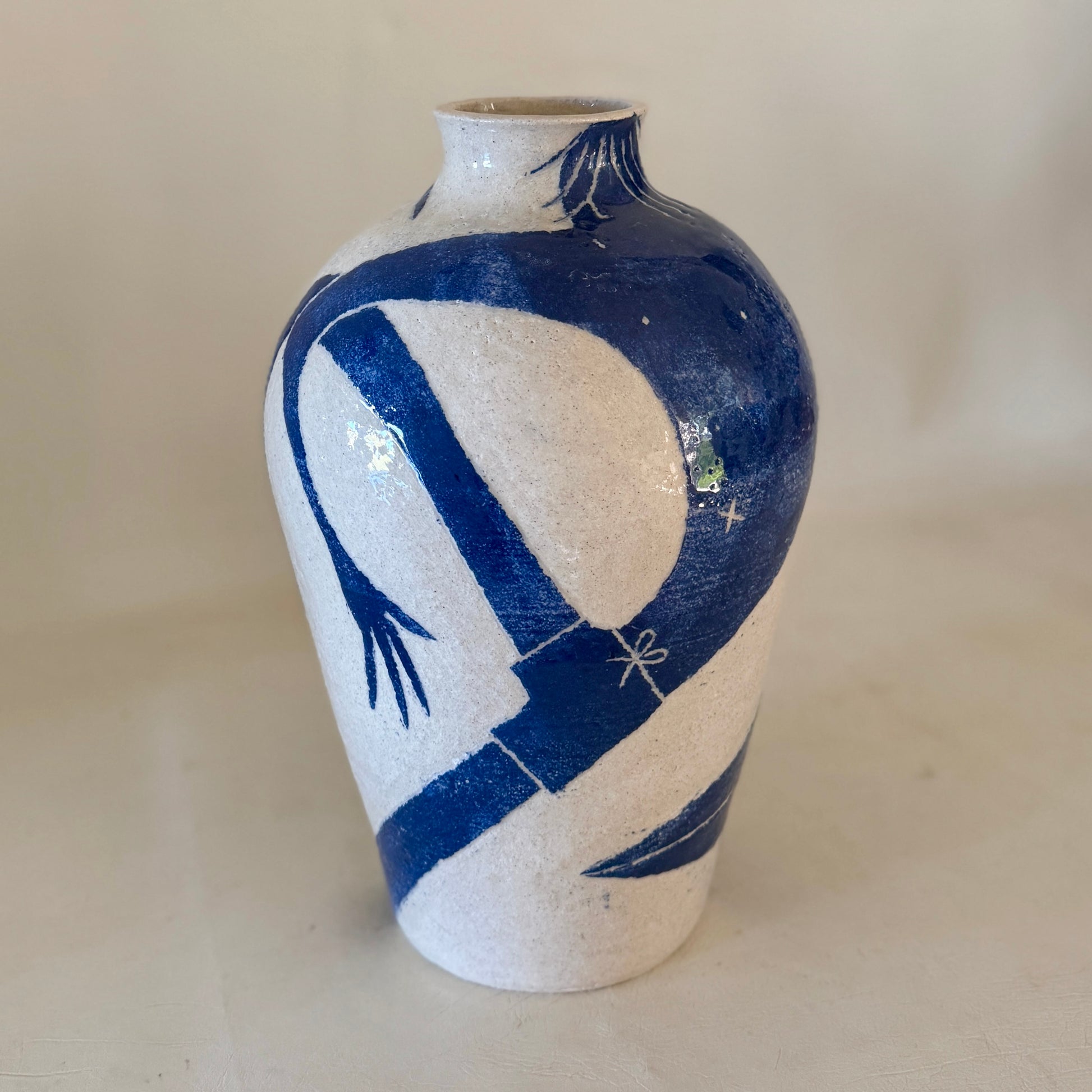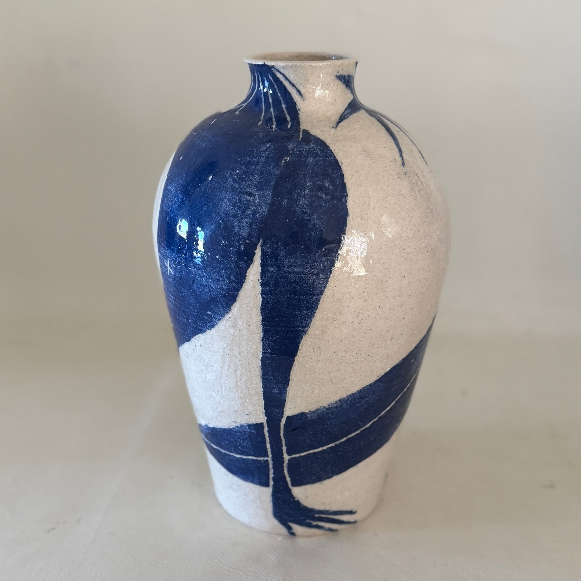 Sandy white raku with sgraffito carved blue slip glazed stoneware ceramic.