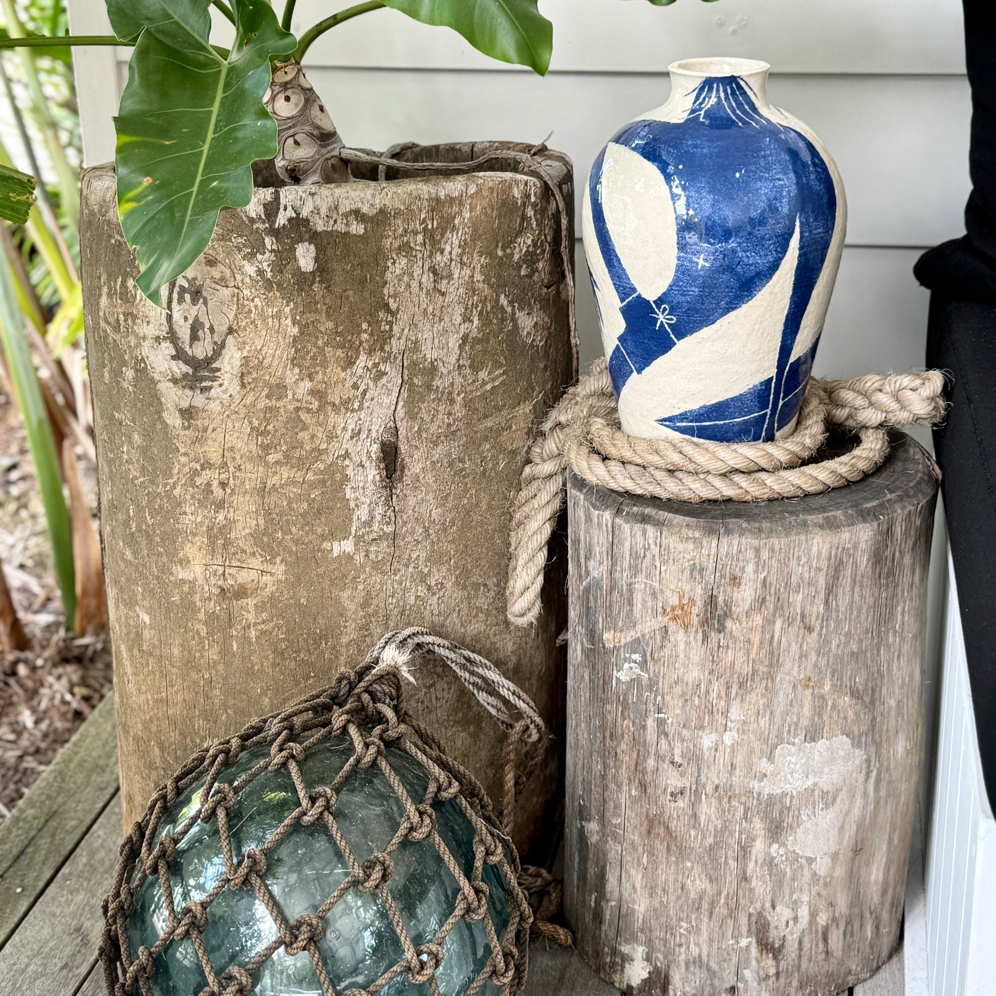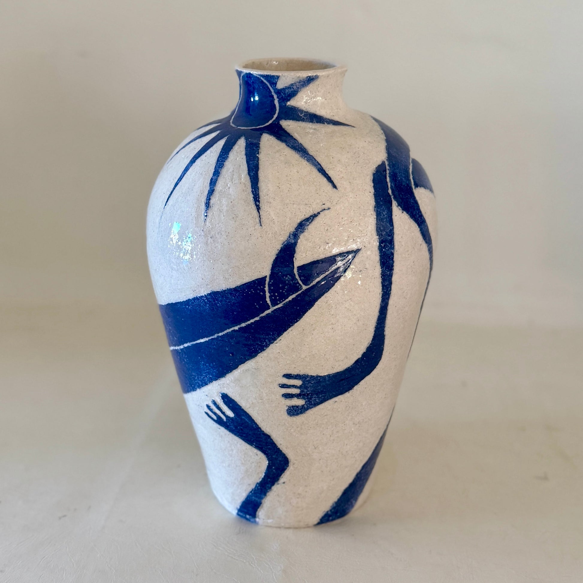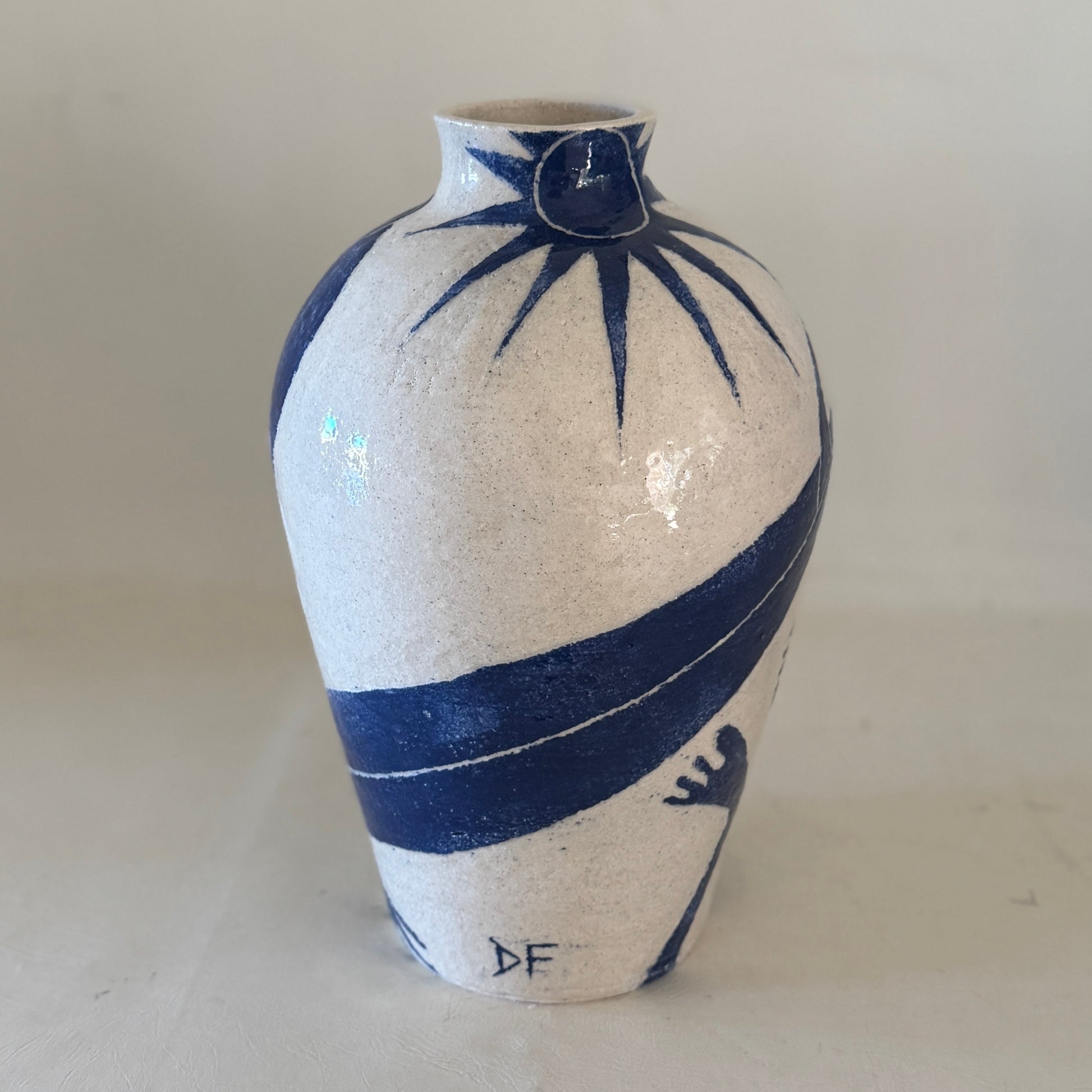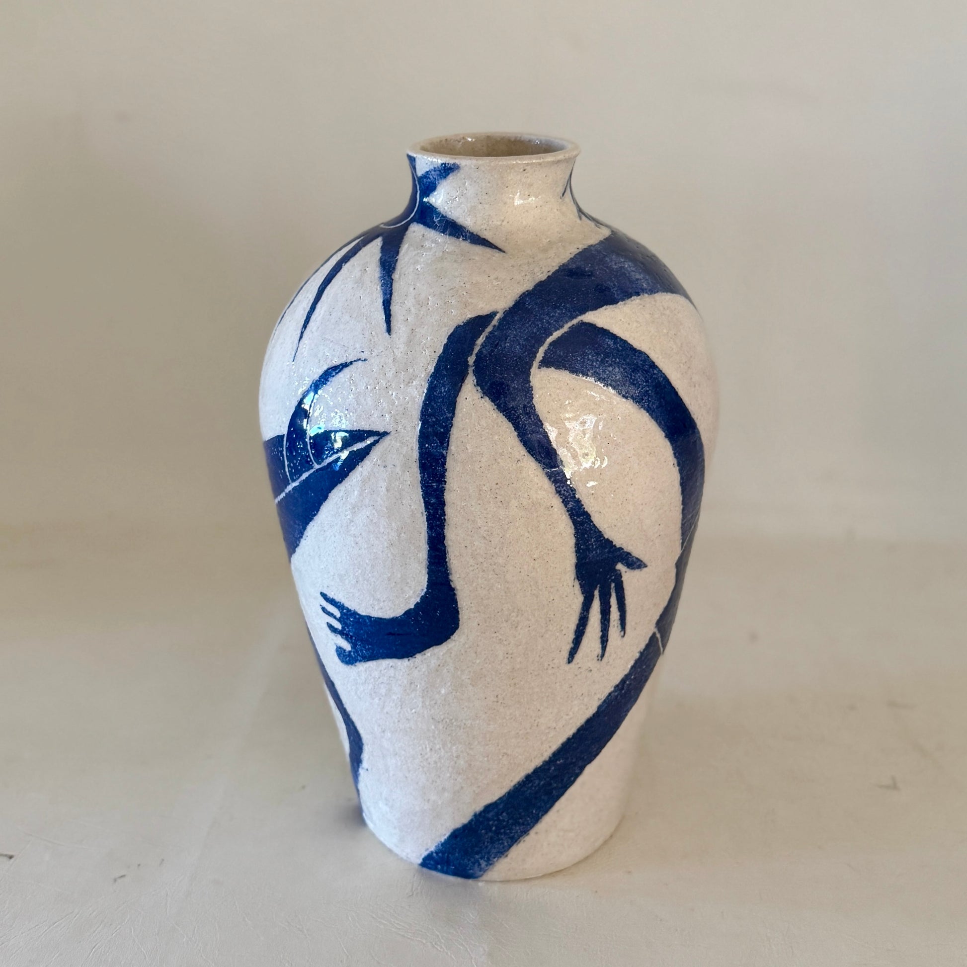 Sandy white raku with sgraffito carved blue slip glazed stoneware ceramic.