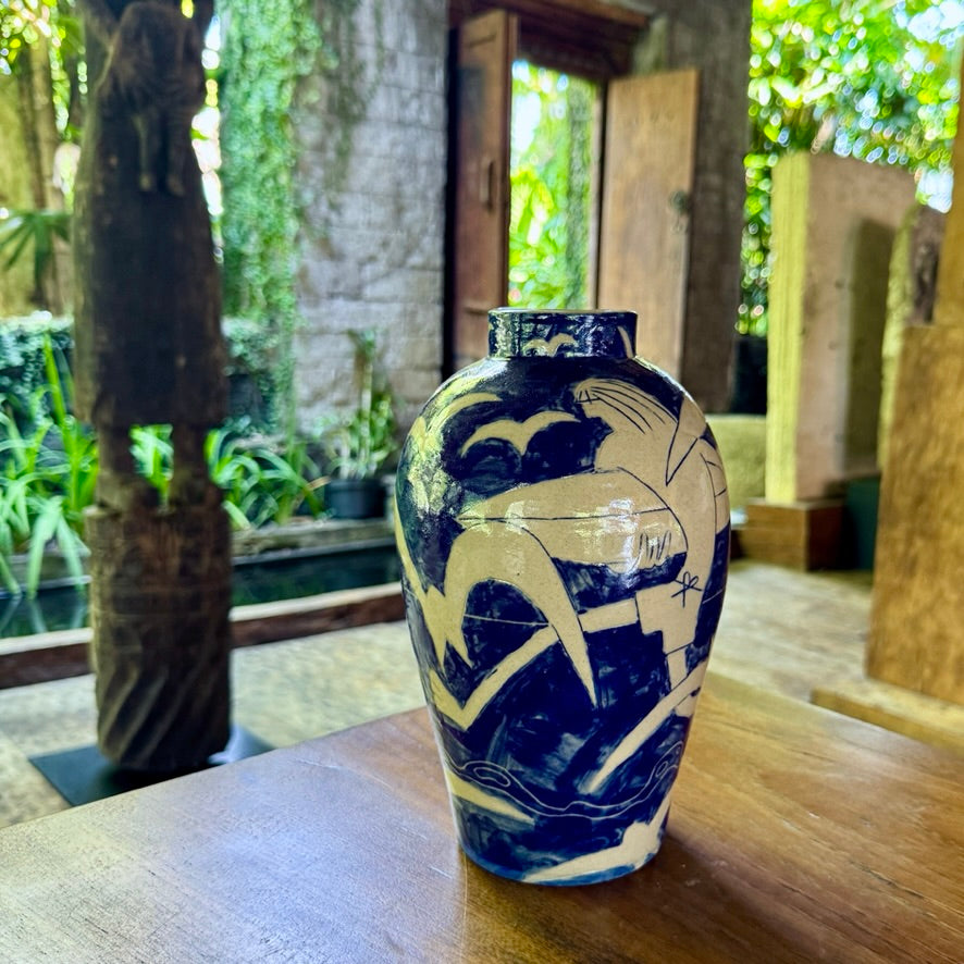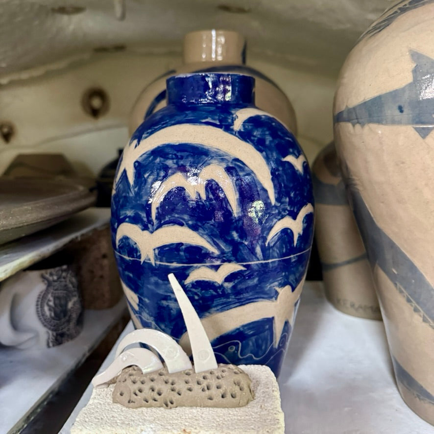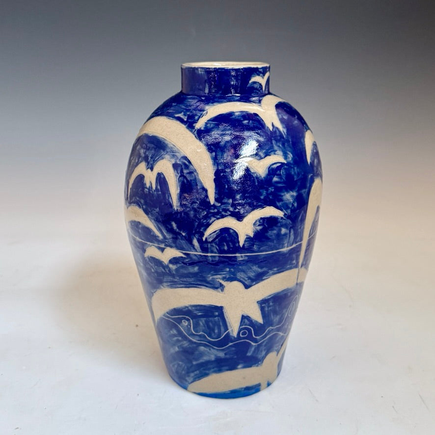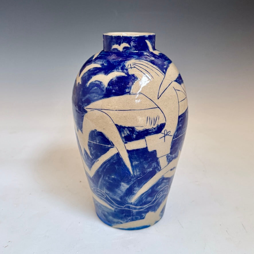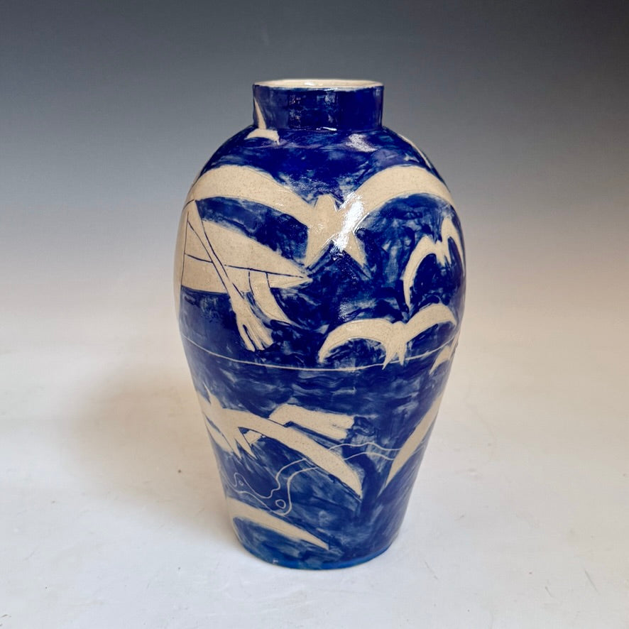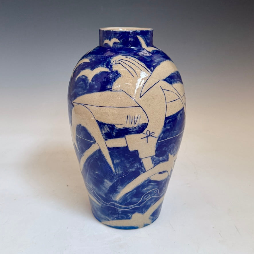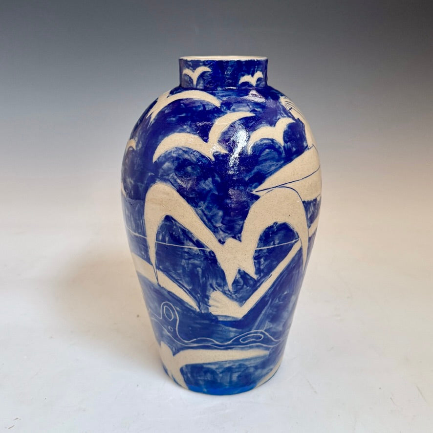 Stoneware ceramic vessel with sgraffito carved slip decoration.