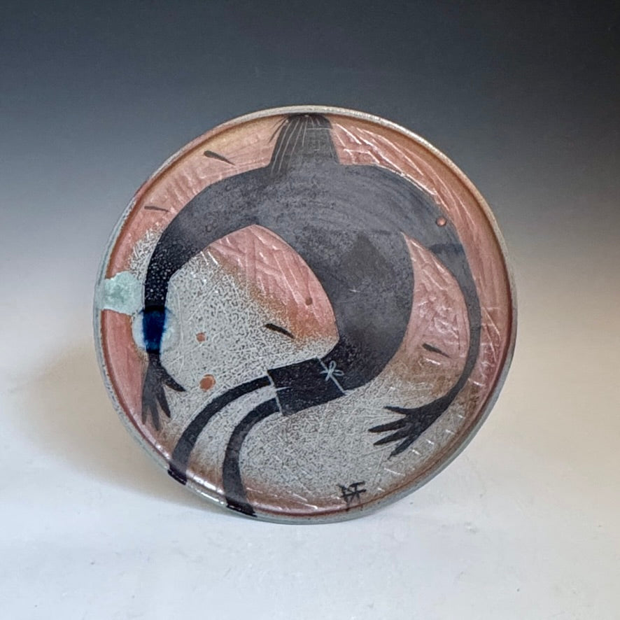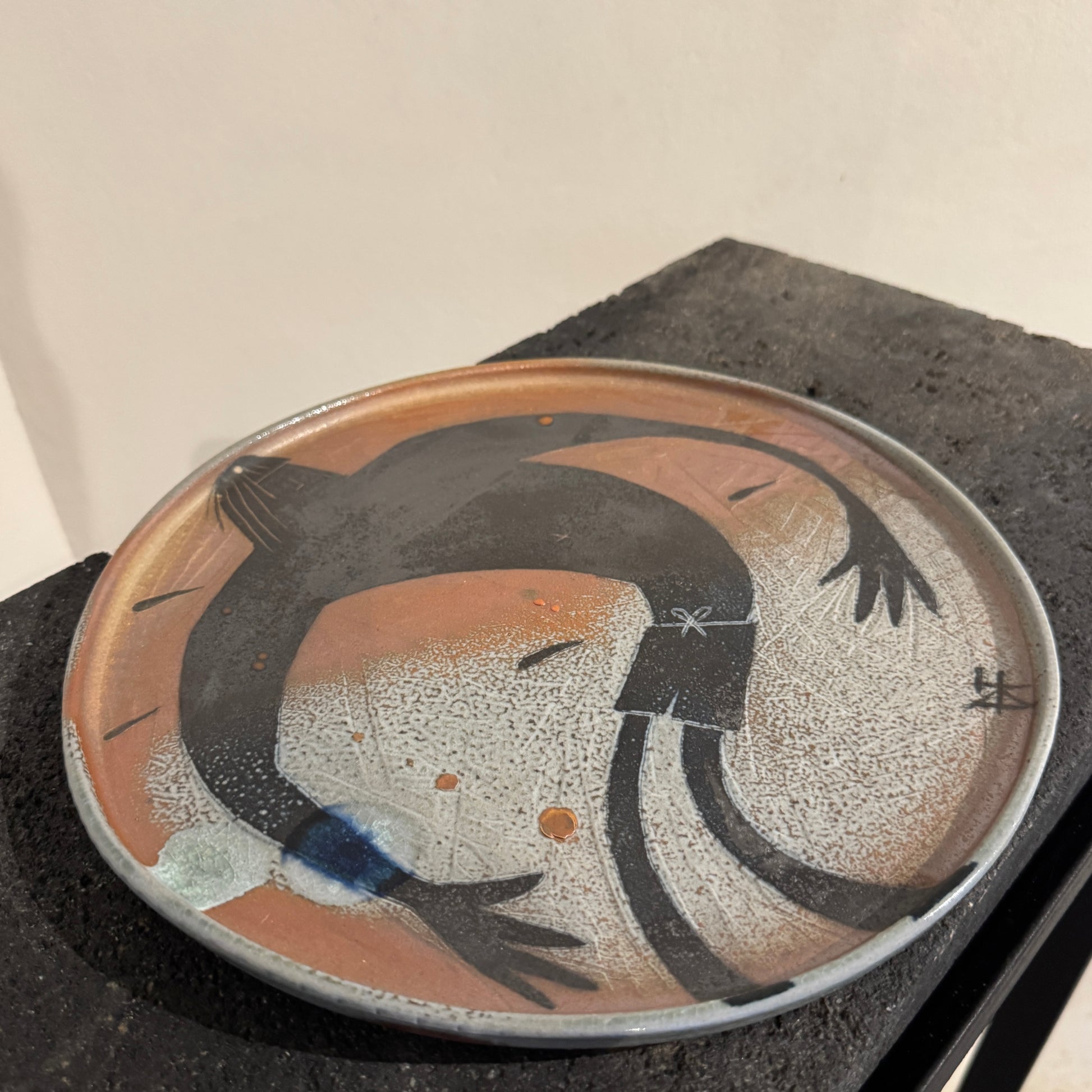 Soda fired stoneware ceramic platter with sgraffito carved slip decoration.