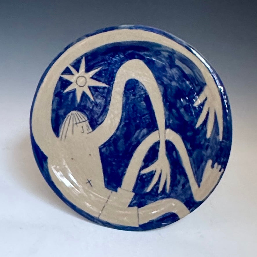 Stoneware ceramic platter with sgraffito carved slip decoration.
