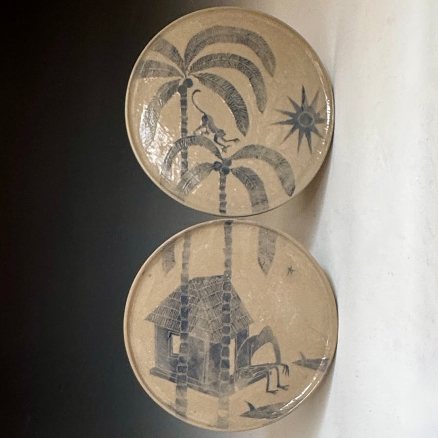 Pair of stoneware ceramic platter with sgraffito carved slip decoration.