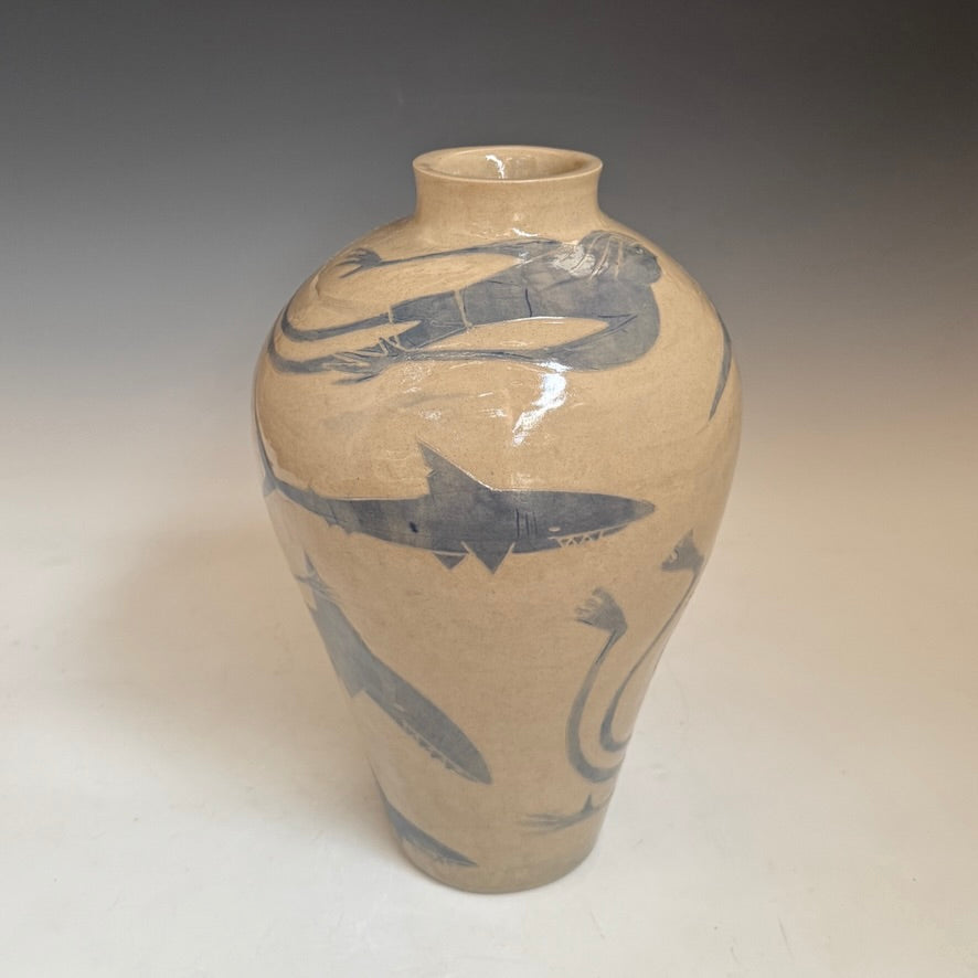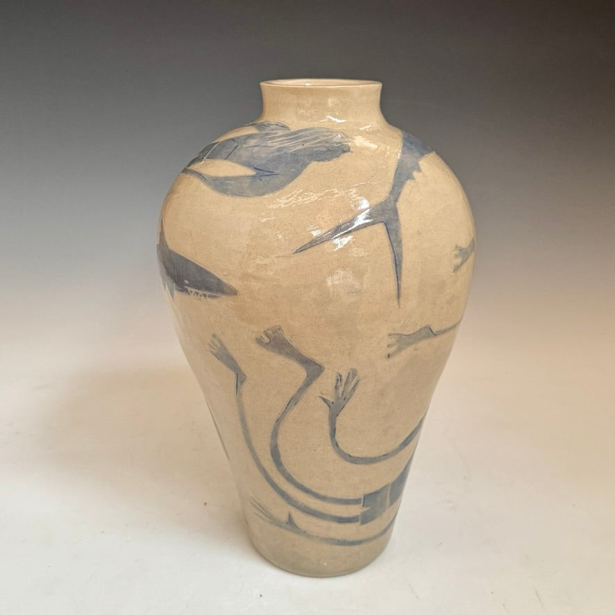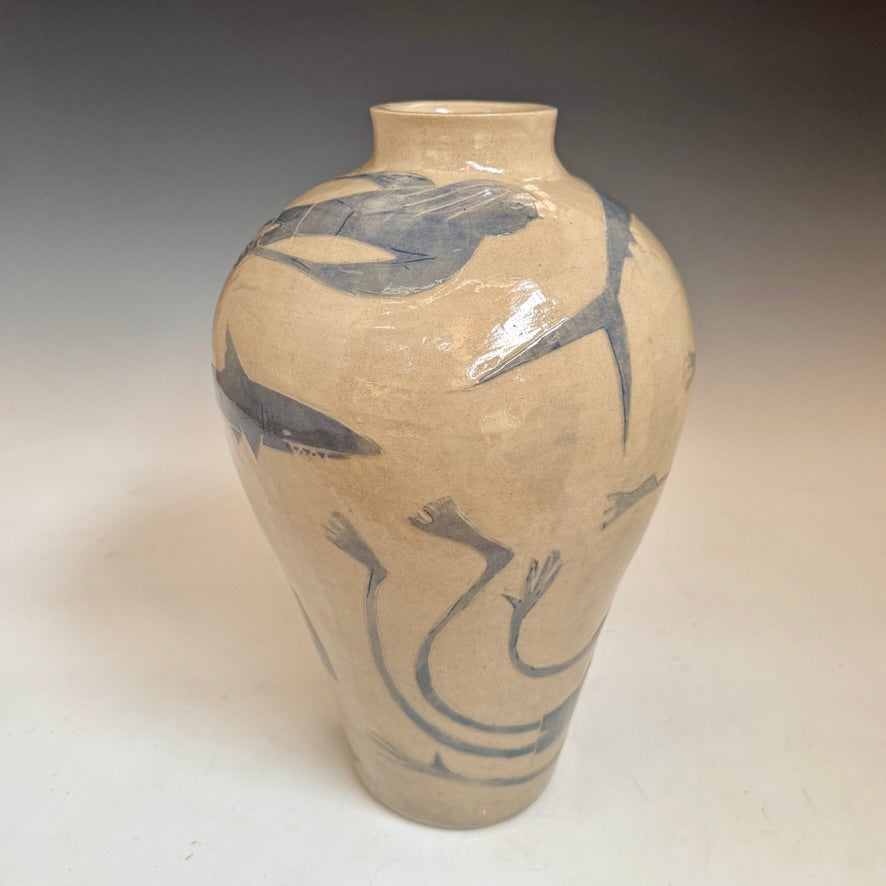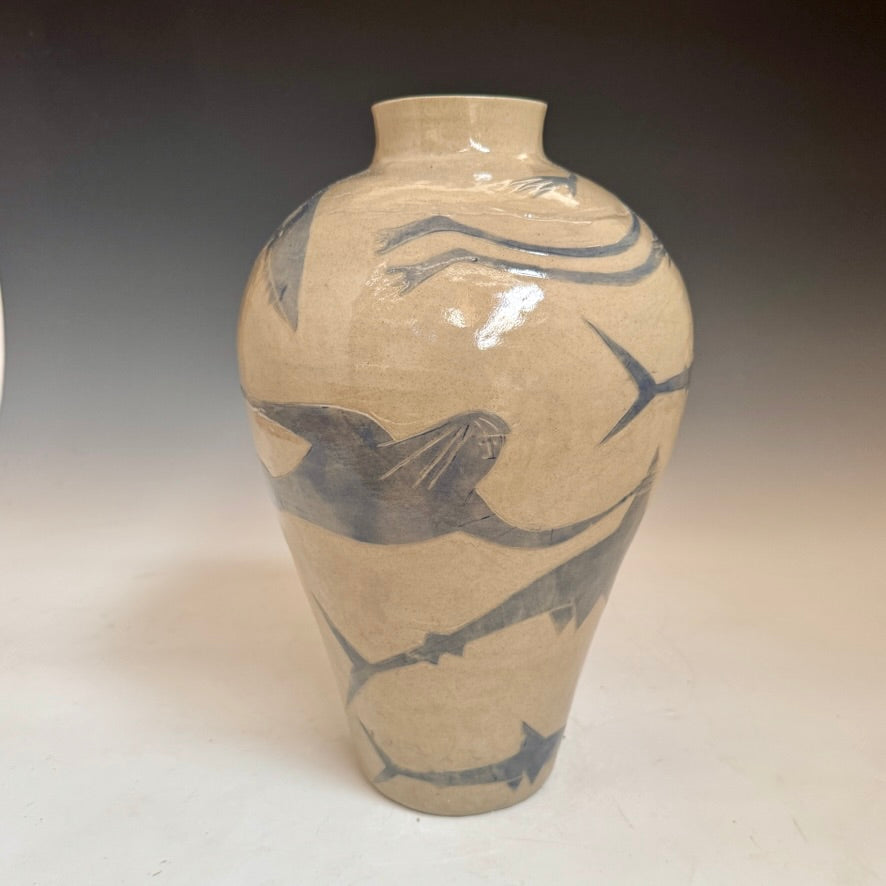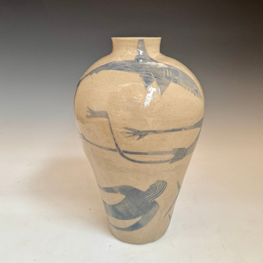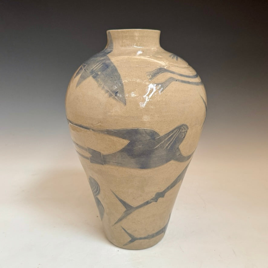 Stoneware ceramic vessel with sgraffito carved blue slip decoration.