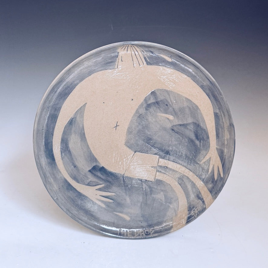 Stoneware ceramic platter with sgraffito carved slip decoration.