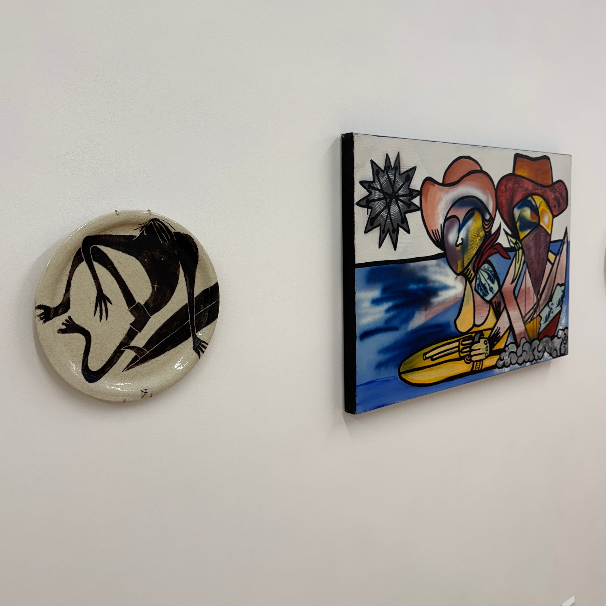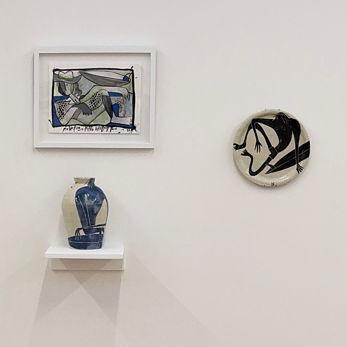 Sandy white raku with sgraffito carved blue slip glazed stoneware ceramic.
