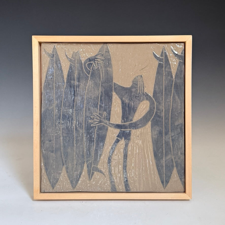 Stoneware ceramic tile with sgraffito carved slip decoration.