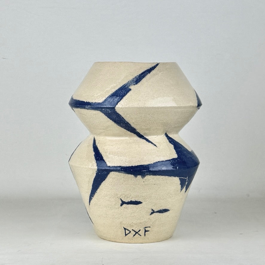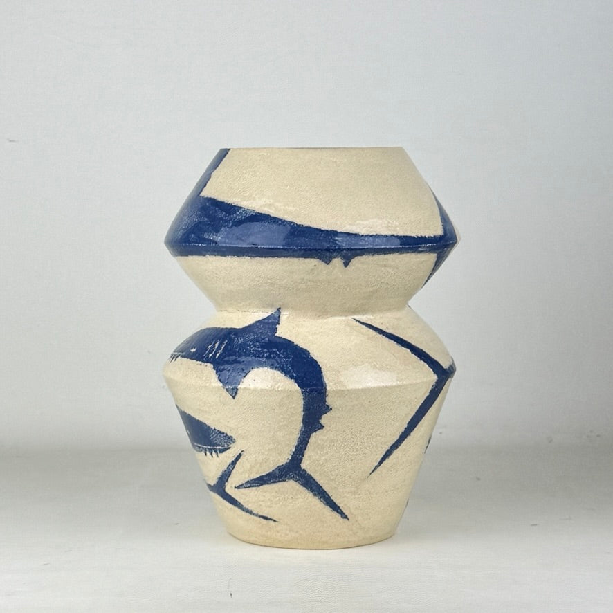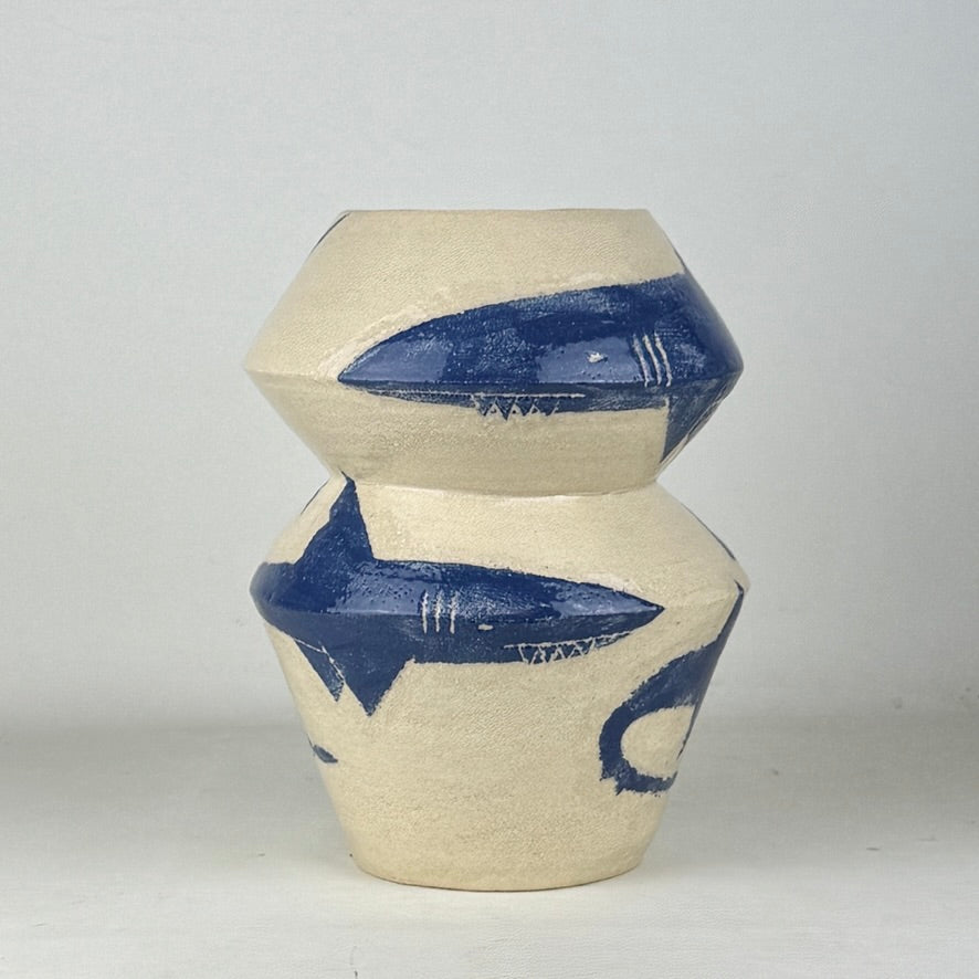 Sandy white raku with sgraffito carved blue slip glazed stoneware ceramic.