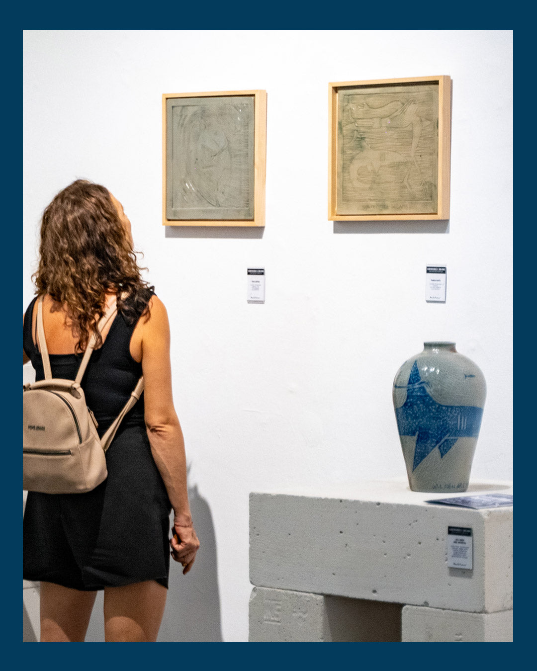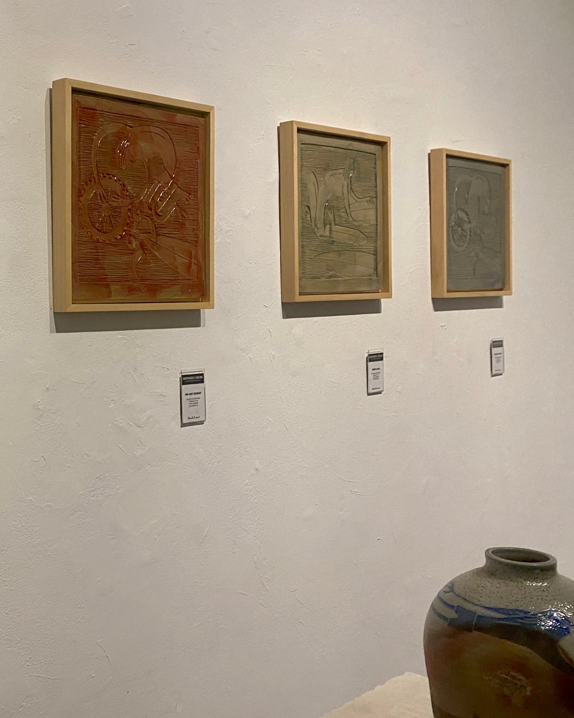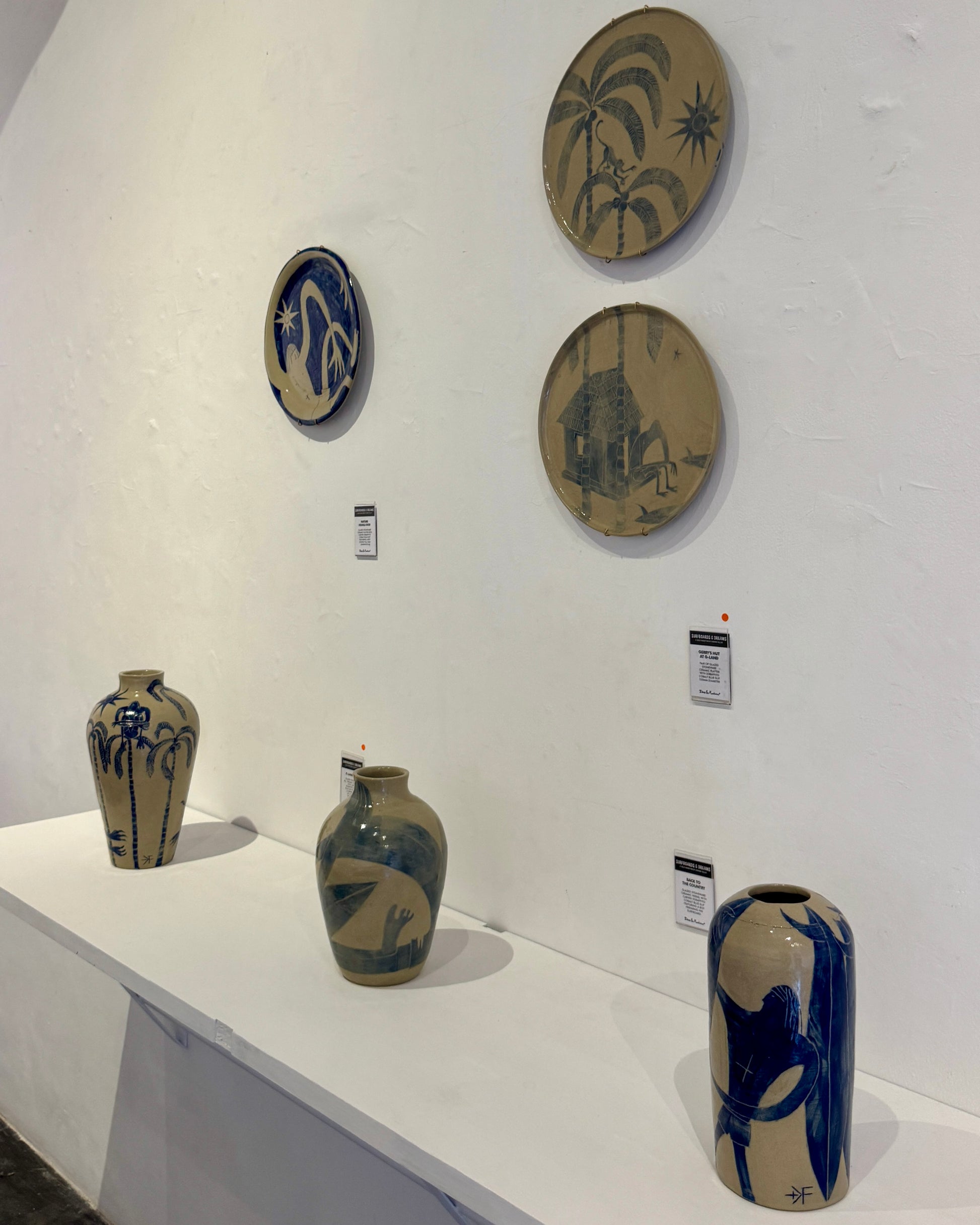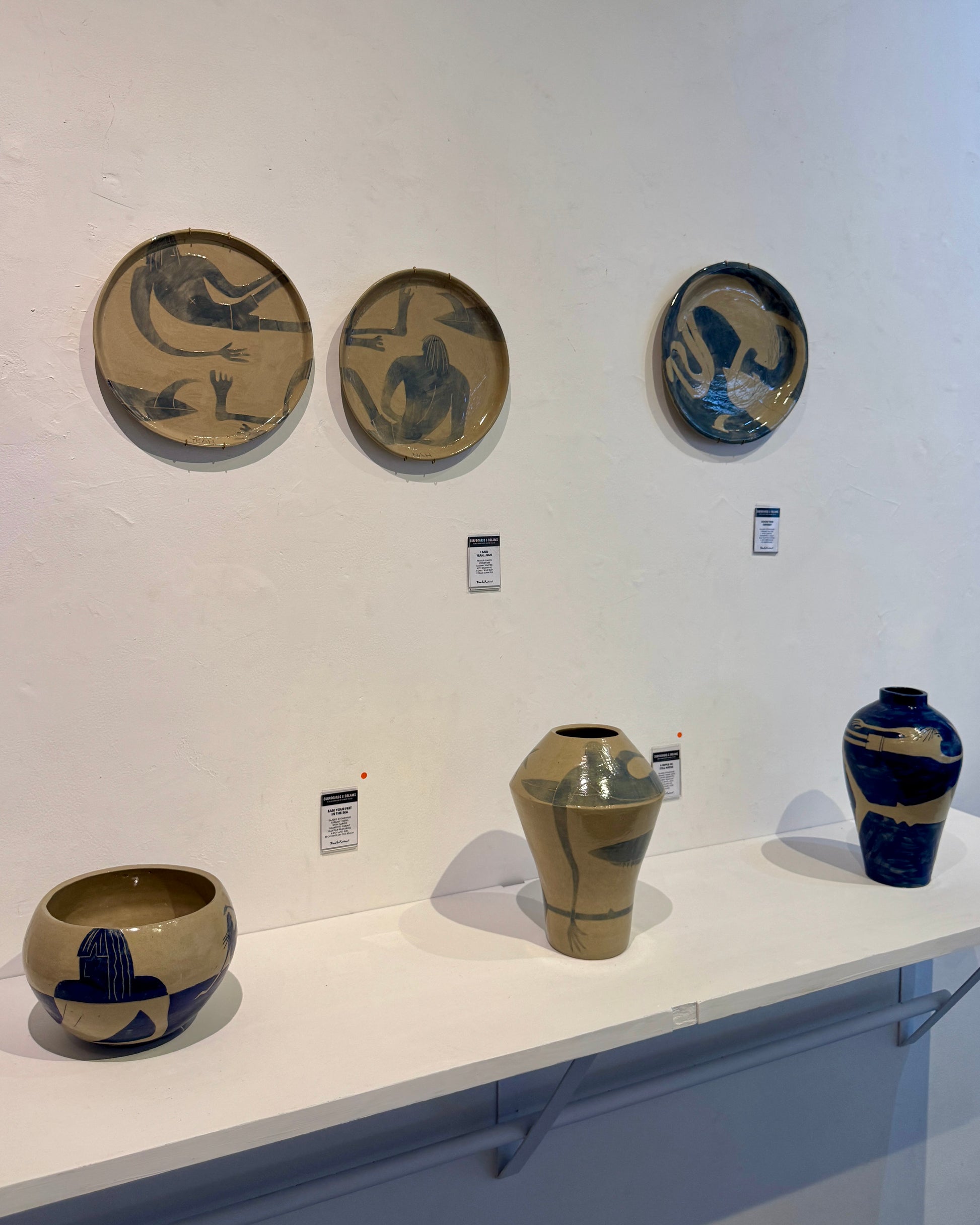 Stoneware ceramic vessel with sgraffito carved blue slip decoration.