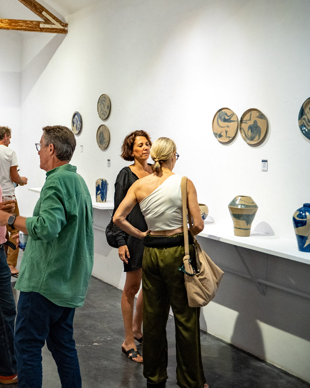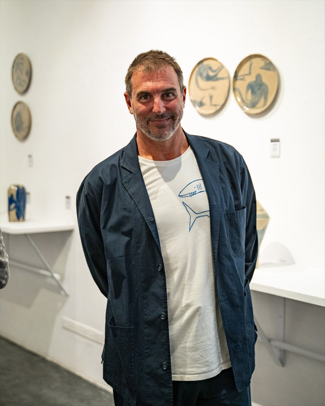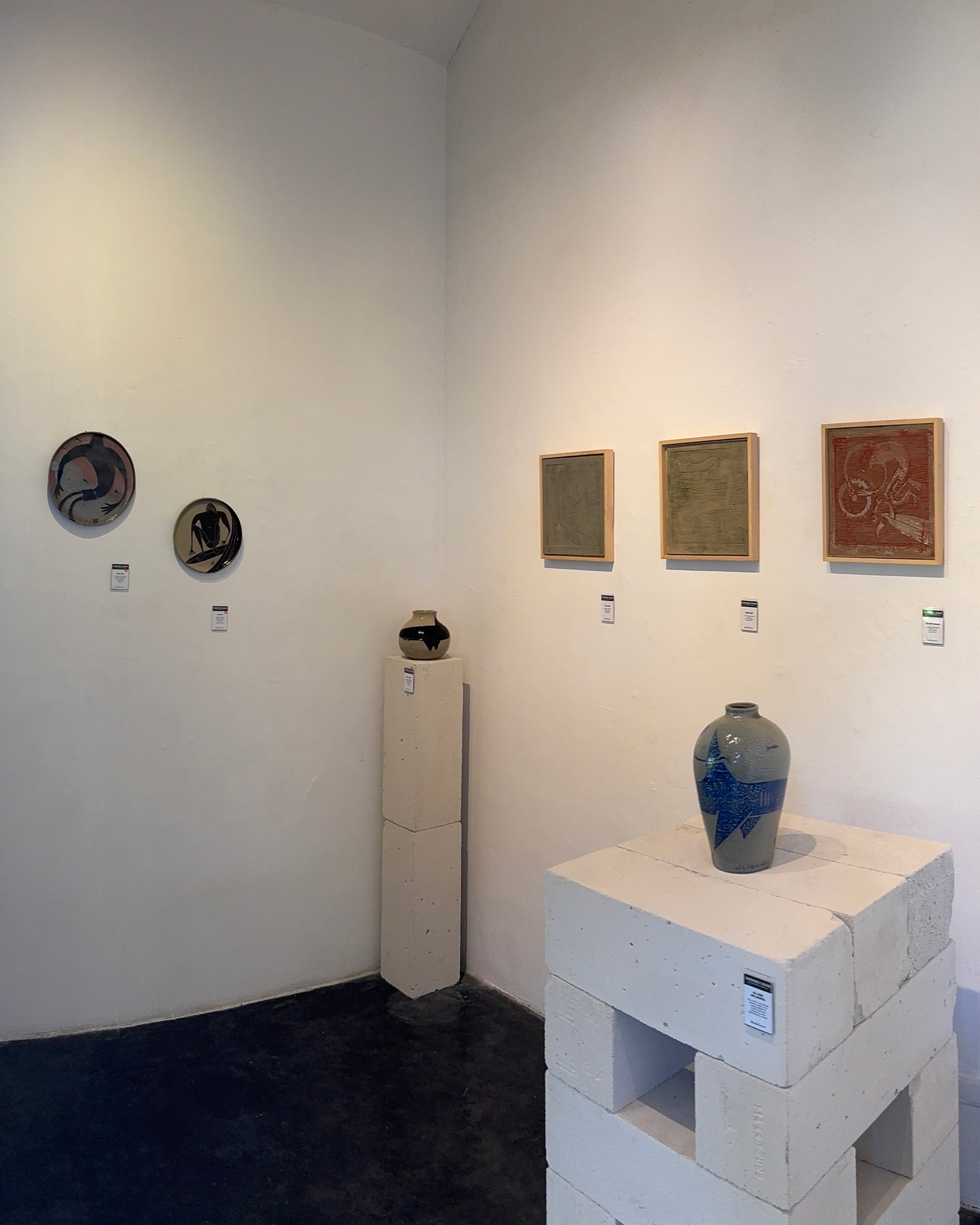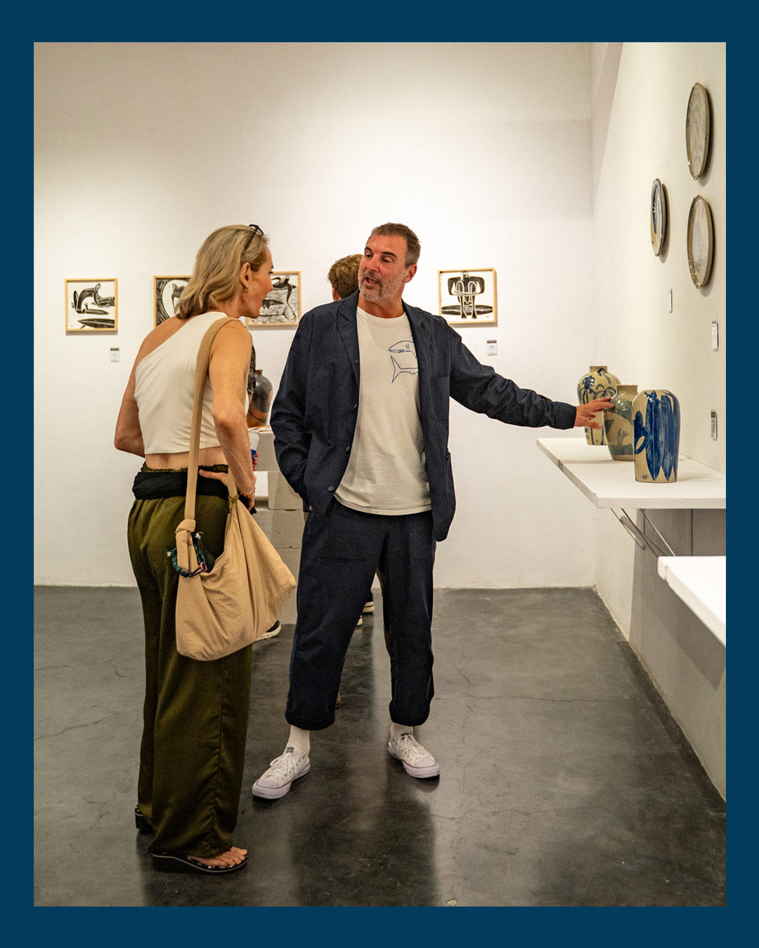 Stoneware ceramic vessel with sgraffito carved blue slip decoration.