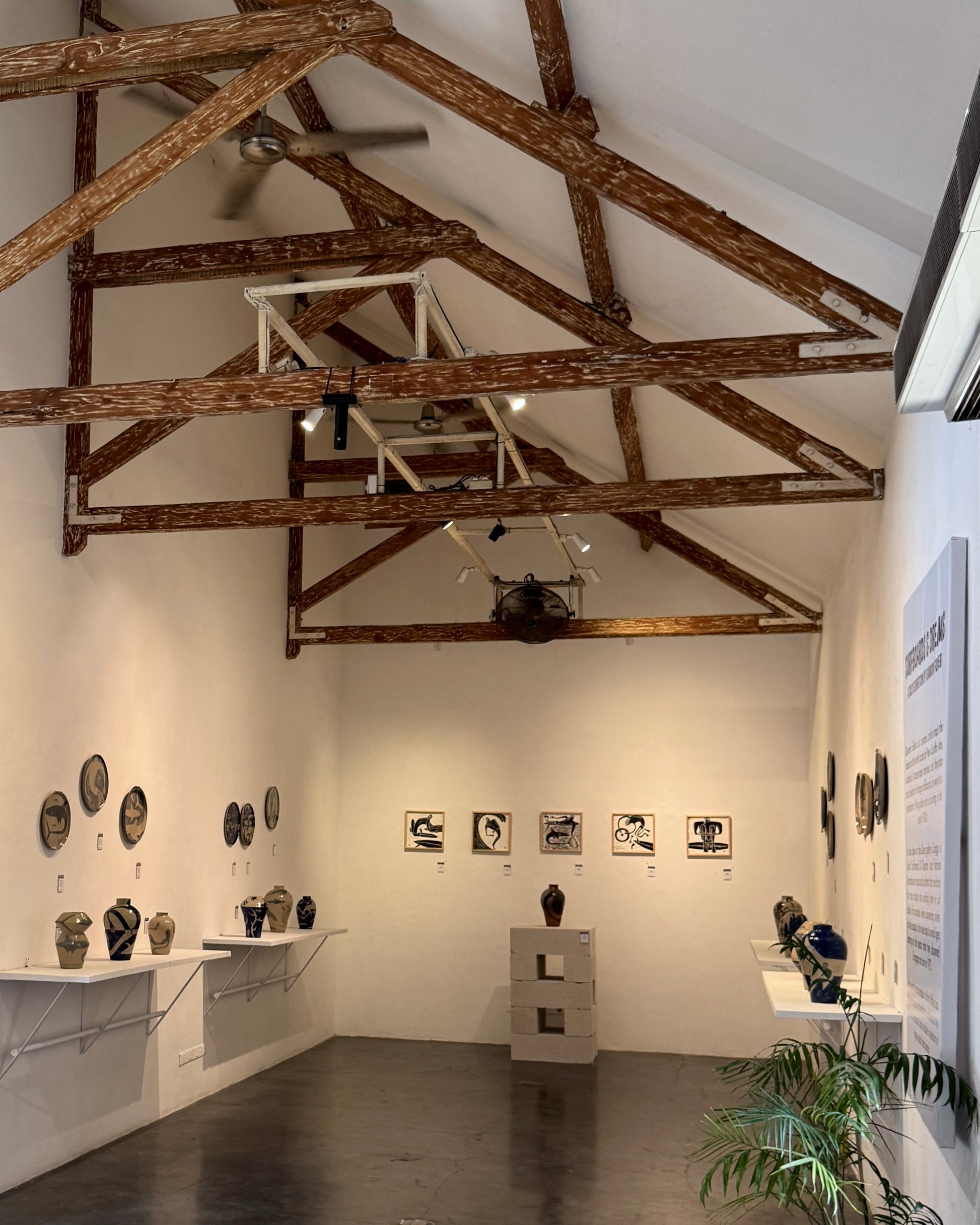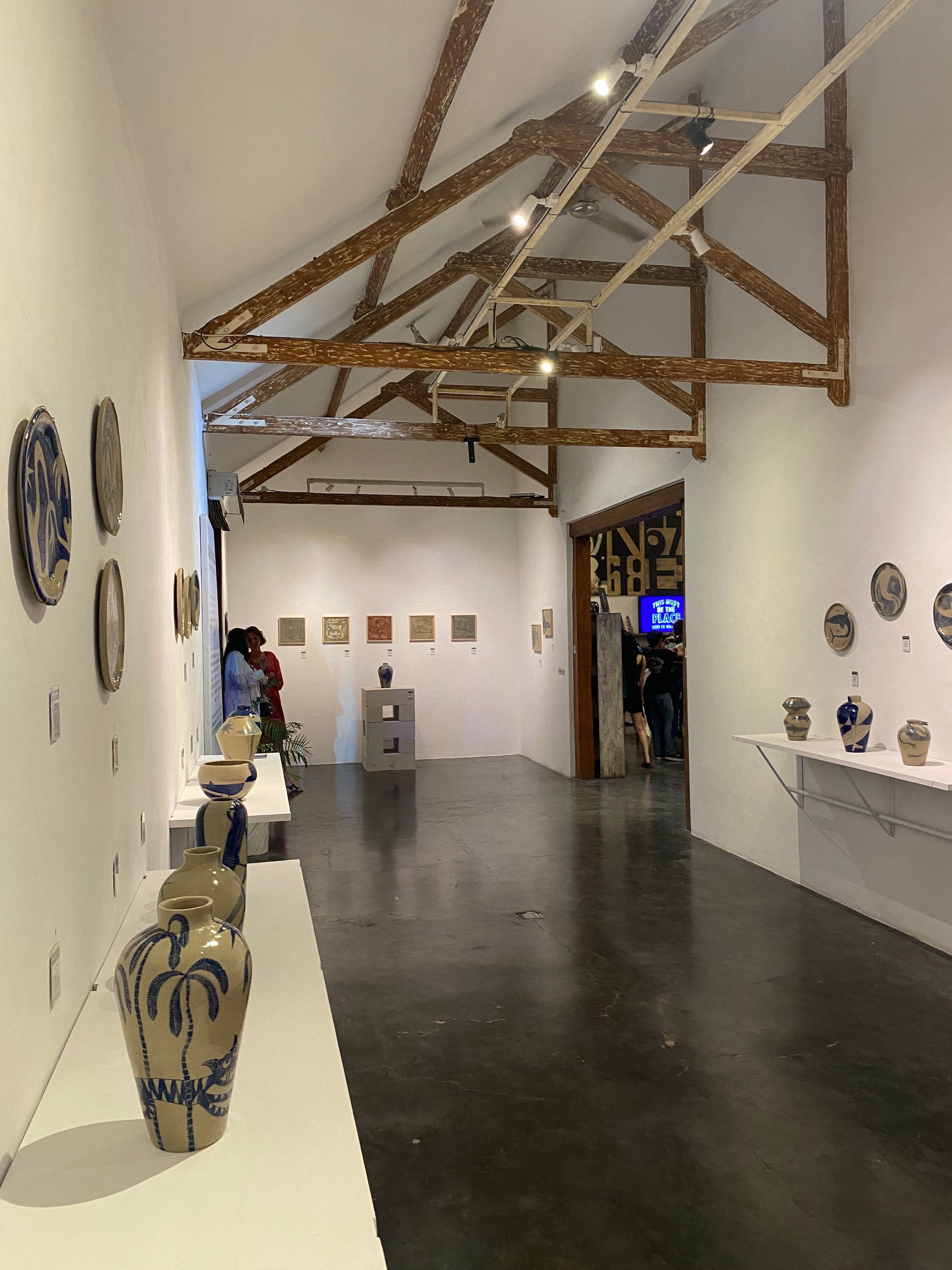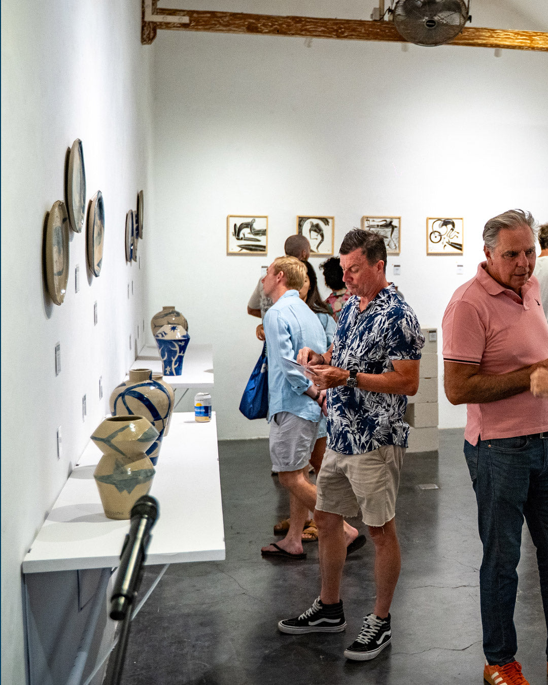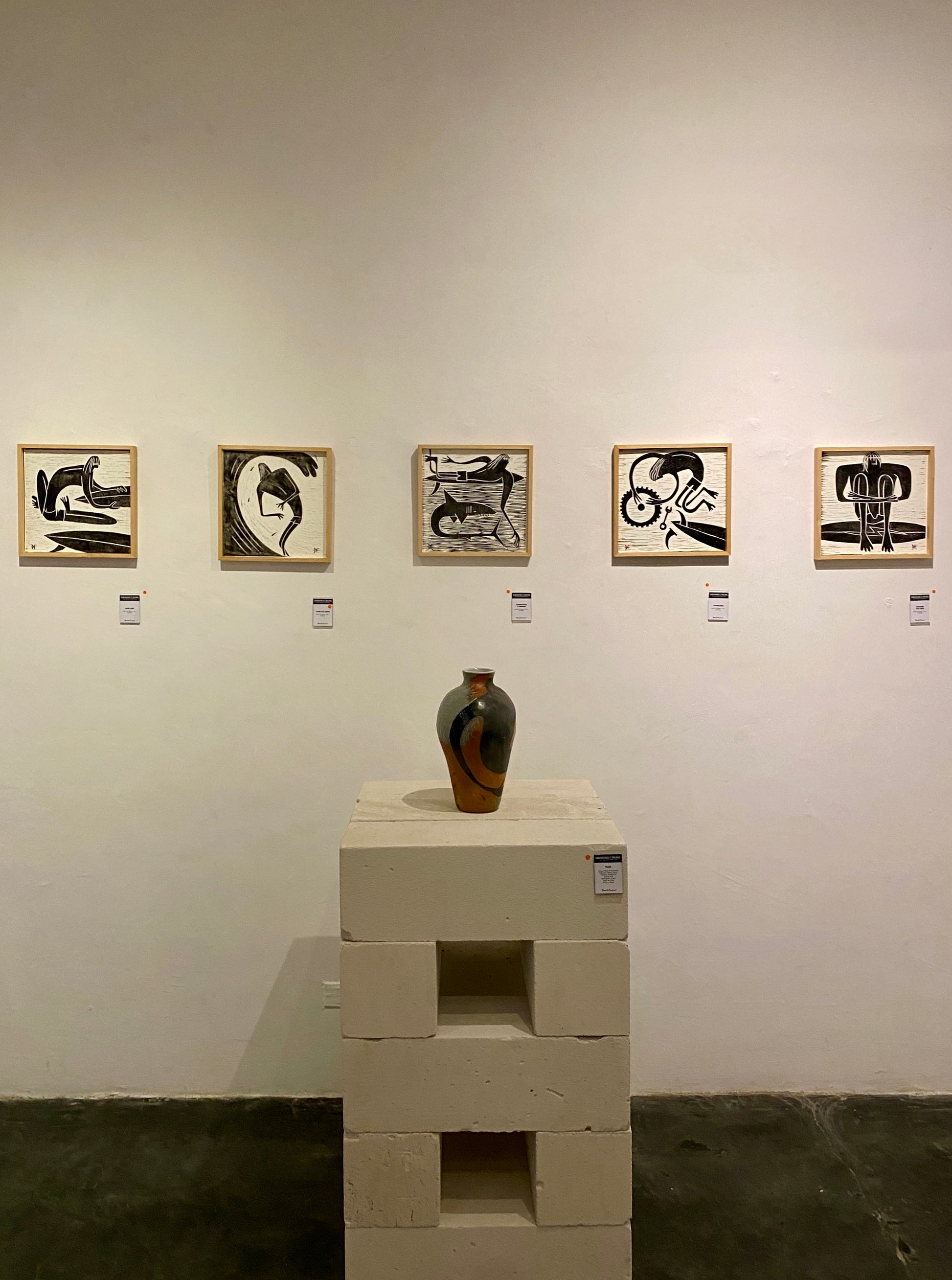 Stoneware ceramic vessel with sgraffito carved blue slip decoration.