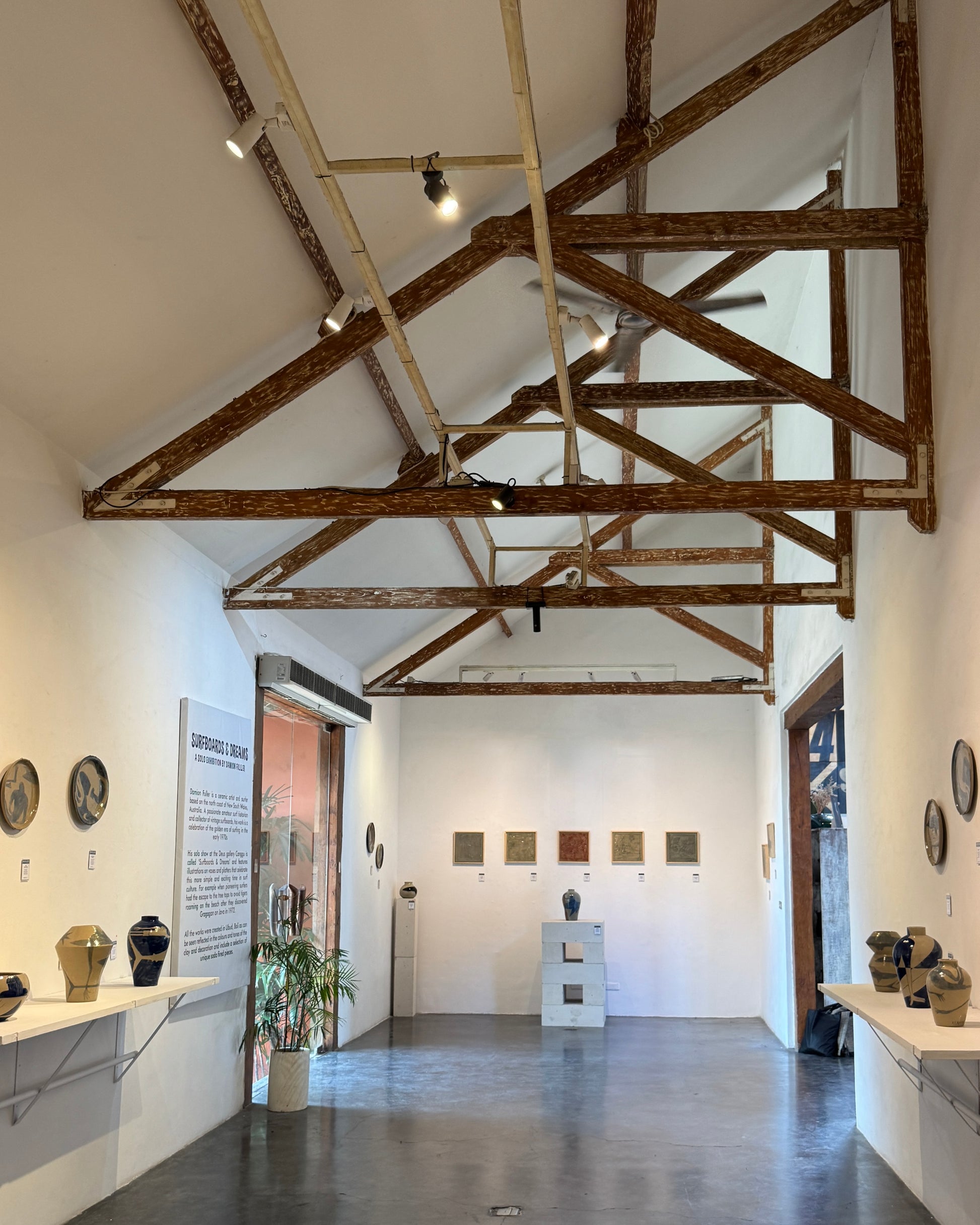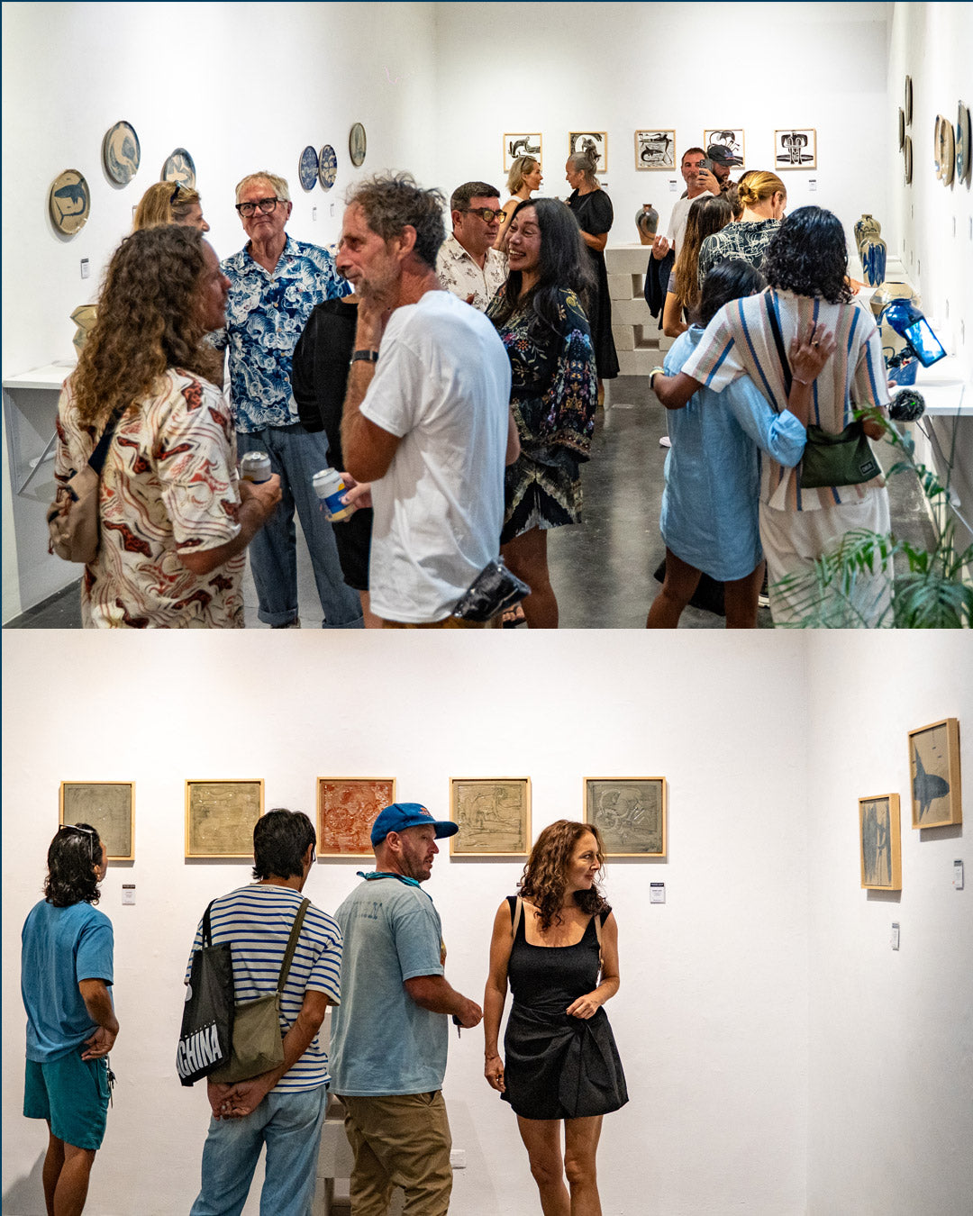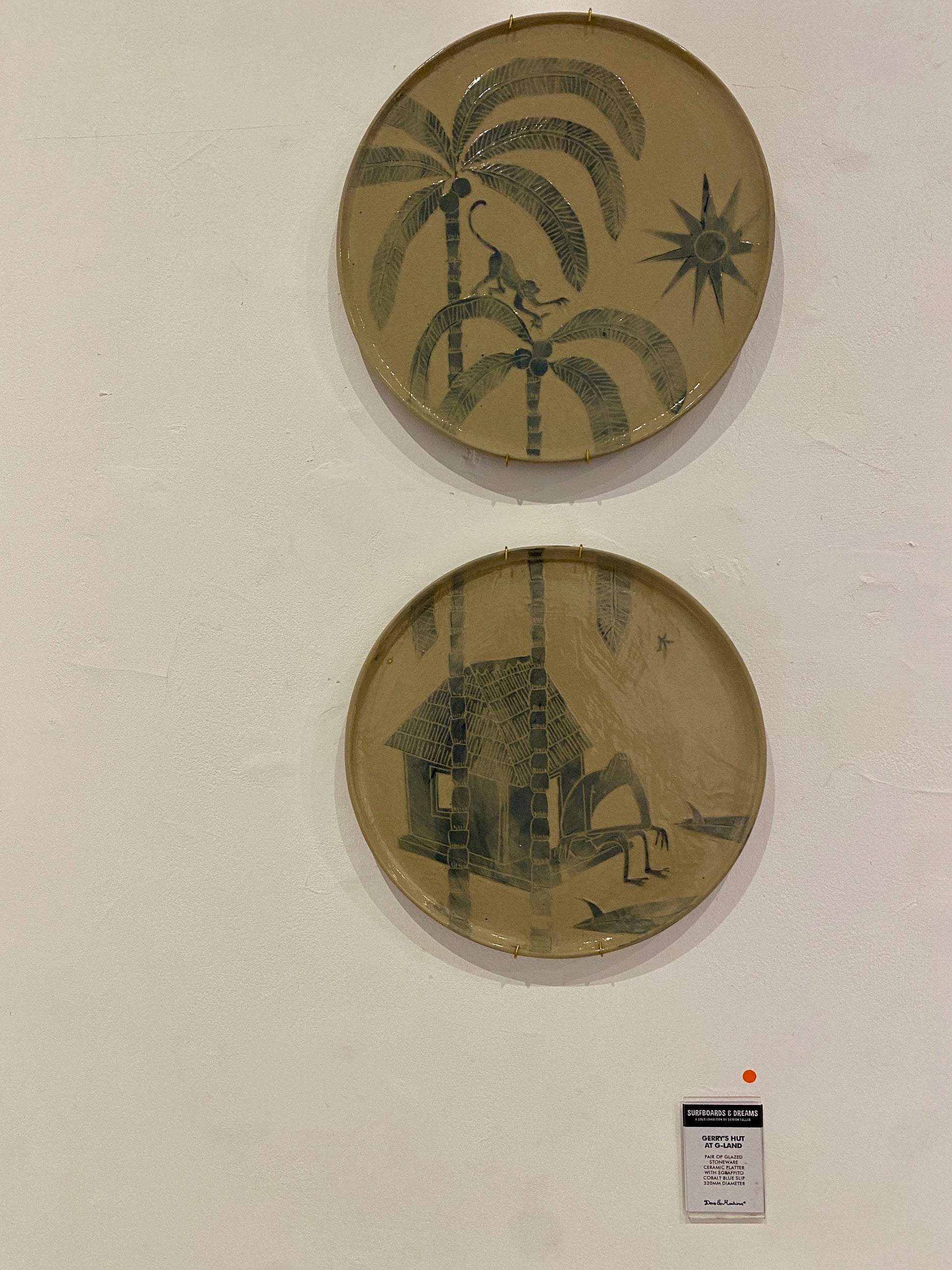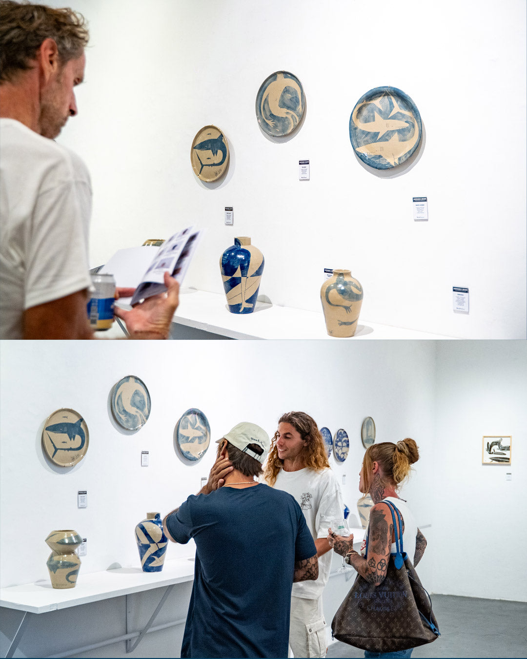 Stoneware ceramic vessel with sgraffito carved blue slip decoration.