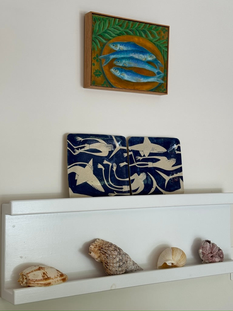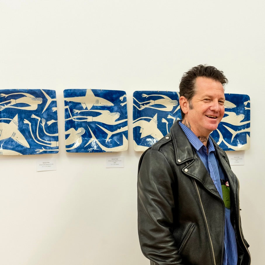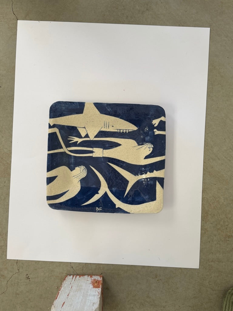 Glazed stoneware ceramic. Sandy white raku with carved slip decoration.