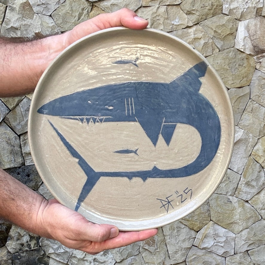 Stoneware ceramic platter with sgraffito carved slip decoration.