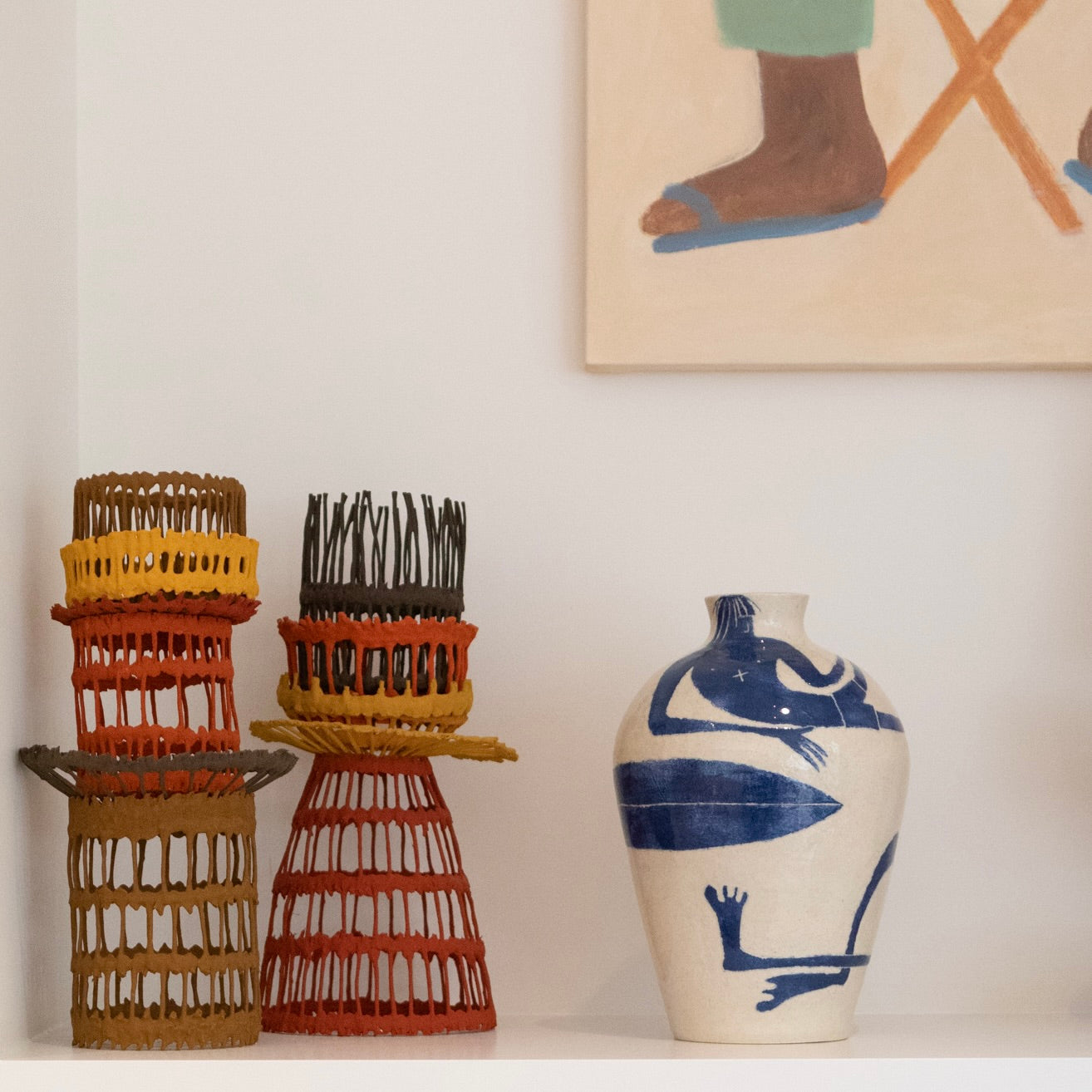 Sandy white raku with sgraffito carved blue slip glazed stoneware ceramic.