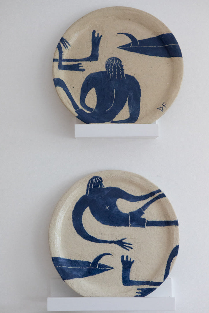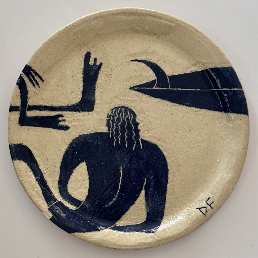 Glazed stoneware ceramic. Sandy white raku with carved slip decoration.